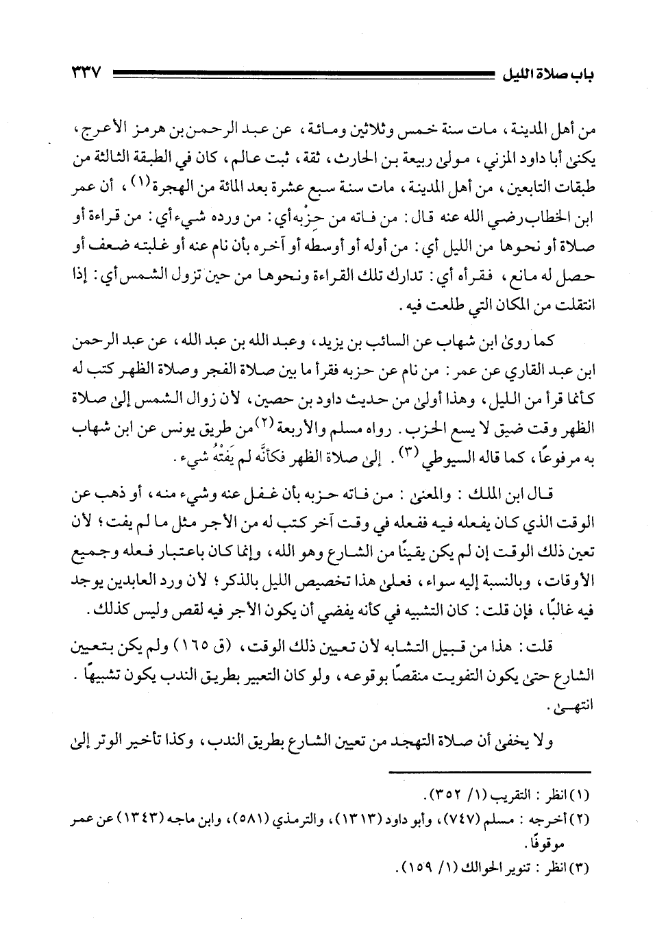 كما روى ابن شهاب عن السائب بن يزيد، وعبد الله بن عبد الله، عن عبد الرحمن بن عبد القاري عن عمر: من نام عن حزبه فقرأ ما بين صلاة الفجر وصلاة الظهر كتب له كأنما قرأ من الليل، وهذا أولى من حديث داود بن حصين، لأن زوال الشمس إلى صلاة الظهر وقت ضيق لا يسع الحزب. رواه مسلم والأربعة (¬2) من طريق يونس عن ابن شهاب به مرفوعًا، كما قاله السيوطي (¬3). إلى صلاة الظهر فكأنَّه لم يَفتْهُ شيء.