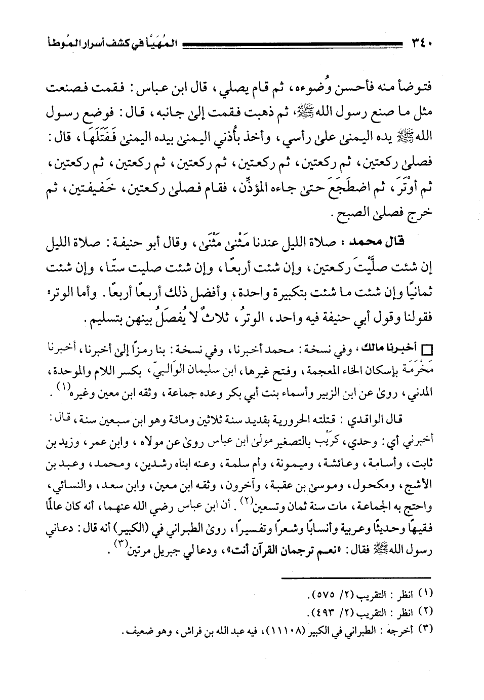 قال محمد: صلاة الليل عندنا مَثْنى مَثْنَى، وقال أبو حنيفة: صلاة الليل إن شئت صلَّيْتَ ركعتين، وإن شئت أربعًا، وإن شئت صليت ستّا، وإن شئت ثمانيًا وإن شئت ما شئت بتكبيرة واحدة، وأفصل ذلك أربعًا أربعًا. وأما الوتر: فقولنا وقول أبي حنيفة فيه واحد، الوترُ، ثلاثٌ لا يُفصَلُ بينهن بتسليم.