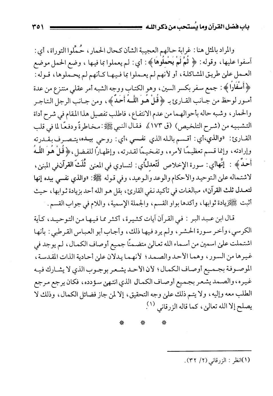 والمراد بالمثل هنا: غرابة حالهم العجيبة الشأن كحال الحمار، حُمِّلوا التوراة، أي: آسفوا عليها، وقوله: {ثُمَّ لَمْ يَحْمِلُوهَا}: أي: لم يعملوا بما فيها، وضع الحمل موضع العمل على طريق المشاكلة، أو لأنهم لم يعملوا بما فيها كأنهم لم يحملوها، قوله: {أَسْفَارًا}: جمع سفر بكسر السين، وهو الكتاب ووجه الشبه أمر عقلي منتزع من عدة أمور لوحظ من جانب القارئ بـ {قُلْ هُوَ اللَّهُ أَحَدٌ}، ومن جانب الرجل التاجر والحمار، وشبه حاله بأحوالهما من عدم الانتفاع، فاطلب تفصيل هذا المقام في شرح أداة التشبيه من (شرح التلخيص) (ق 173)، فقال النبي - صلى الله عليه وسلم -: مخاطرةً ودفعًا لما في قلب القارئ: "والذي، أي: أقسم بالله الذي نفسي، أي: روحي بيده، يتصرف بقدرته وإرادته، وإنما قسم تعظيمًا لأمره، وتفخيمًا لقدرته، وإظهارًا للفضل، {قُلْ هُوَ اللَّهُ أَحَدٌ}: إنَّها أي: سورة الإِخلاص لَتْعدِلُ أي: لتساوي في المعنى ثُلثَ القرآن في المبنى، لاشتماله على التوحيد والأحكام والوعد والوعيد، وفي قوله - صلى الله عليه وسلم -: "والذي نفسي بيده إنها لتعدل ثلث القرآن"، مبالغات في تأكيد نفي القارئ، بقل هو الله أحد بزيادة ثوابها، حيث أثبت - صلى الله عليه وسلم - زيادة ثوابها، وأكدها بواو القسم، والجملة الإِسمية، واللام في جواب القسم.