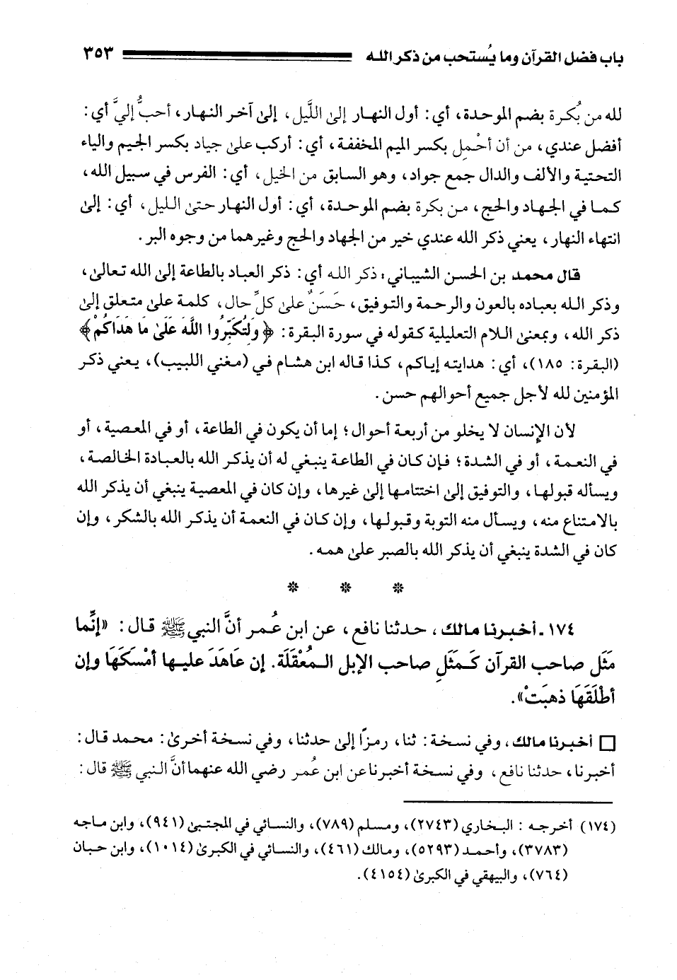 174 - أخبرنا مالك، حدثنا نافع، عن ابن عُمر أنَّ النبي - صلى الله عليه وسلم - قال: "إنَّما مَثَل صاحب القرآن كَمَثَلِ صاحب الإبل المُعْقَلَة. إن عَاهَدَ عليها أمْسَكَهَا وإن أطْلَقَهَا ذهبَتْ".