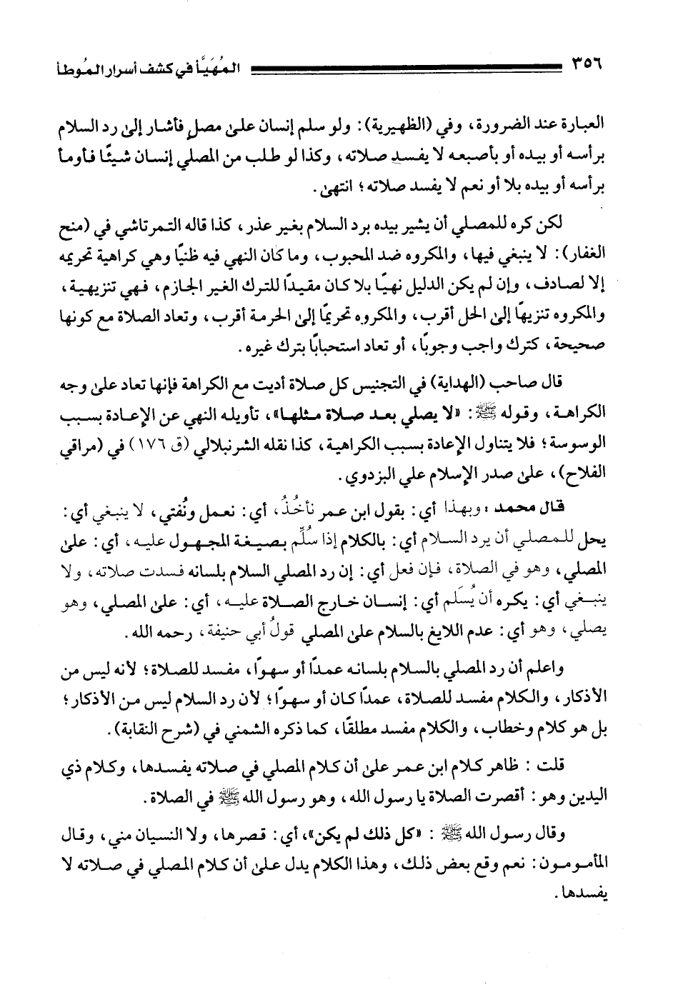 واعلم أن رد المصلي بالسلام بلسانه عمدًا أو سهوًا، مفسد للصلاة؛ لأنه ليس من الأذكار، والكلام مفسد للصلاة، عمدًا كان أو سهوًا؛ لأن رد السلام ليس من الأذكار؛ بل هو كلام وخطاب، والكلام مفسد مطلقًا، كما ذكره الشمني في (شرح النقابة).