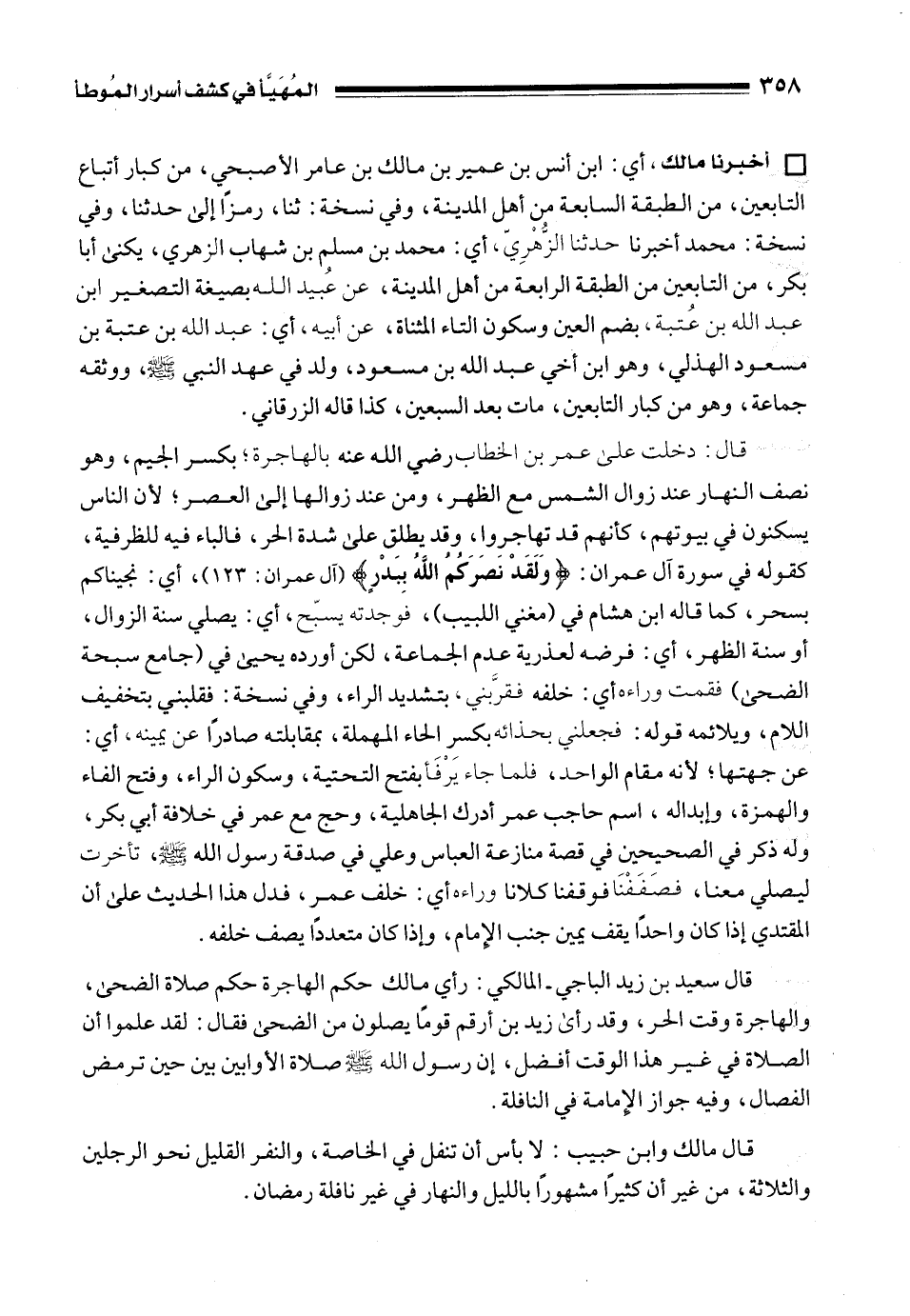قال: دخلت على عمر بن الخطاب رضي الله عنه بالهاجرة؛ بكسر الجيم، وهو نصف النهار عند زوال الشمس مع الظهر، ومن عند زوالها إلى العصر؛ لأن الناس يسكنون في بيوتهم، كأنهم قد تهاجروا، وقد يطلق على شدة الحر، فالباء فيه للظرفية، كقوله في سورة آل عمران: {وَلَقَدْ نَصَرَكُمُ اللَّهُ بِبَدْرٍ} [آل عمران: 123]، أي: نجيناكم بسحر، كما قاله ابن هشام في (مغني اللبيب)، فوجدته يسبّح، أي: يصلي سنة الزوال، أو سنة الظهر، أي: فرضه لعذرية عدم الجماعة، لكن أورده يحيى في (جامع سبحة الضحى) فقمت وراءه أي: خلفه فقرَّبني، بتشديد الراء، وفي نسخة: فقلبني بتخفيف اللام، ويلائمه قوله: فجعلني بحذائه بكسر الحاء المهملة، بمقابلته صادرًا عن يمينه، أي: عن جهتها؛ لأنه مقام الواحد، فلما جاء يَرْفَأ بفتح التحتية، وسكون الراء، وفتح الفاء والهمزة، وإبداله، اسم حاجب عمر أدرك الجاهلية، وحج مع عمر في خلافة أبي بكر، وله ذكر في الصحيحين في قصة منازعة العباس وعلي في صدقة رسول الله - صلى الله عليه وسلم -، تأخرت ليصلي معنا، فصَفَفْنَا فوقفنا كلانا وراءه أي: خلف عمر، فدل هذا الحديث على أن المقتدي إذا كان واحدًا يقف يمين جنب الإِمام، وإذا كان متعددًا يصف خلفه.
