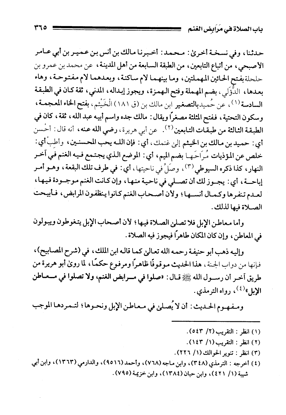 حدثنا، وفي نسخة أخرى: محمد: أخبرنا مالك بن أنس بن عمير بن أبي عامر الأصبحي، من أتباع التابعين، من الطبقة السابعة من أهل المدينة، عن محمد بن عمرو بن حلحلة بفتح الحائين المهملتين، وما بينهما لام ساكنة، وبعدهما لام مفتوحة، وهاء بعدها، الدُّؤَلي، بضم المهملة وفتح الهمزة، ويجوز إبداله، المدني، ثقة كان في الطبقة السادسة (¬1)، عن حُميد بالتصغير ابن مالك بن (ق 181) الْخَيْثم، بفتح الخاء المعجمة، وسكون التحتية، ففتح المثلثة مصغرًا ويقال: مالك جده واسم أبيه عبد الله، ثقة، كان في الطبقة الثالثة من طبقات التابعين (¬2). عن أبي هريرة، رضي الله عنه، أنه قال: أحْسن أي: حميد بن مالك بن الخيثم إلى غنمك، أي: فإن الله يحب المحسنين، وأطِبْ أي: خلص عن المؤذيات مُرَاحَها بضم الميم، أي: الموضح الذي يجتمع فيه الغنم في آخر النهار، كذا ذكره السيوطي (¬3)، وصَلِّ في ناحيتها، أي: في طرف تلك البقعة، وهو أمر إباحة، أي: يجوز لك أن تصلي في ناحية منها، وإن كانت الغنم موجودة فيها، لعدم تنفرها وكمال أنسها؛ ولأن أصحاب الغنم كانوا ينظفون المرابض، فأبيحت الصلاة فيها لذلك.