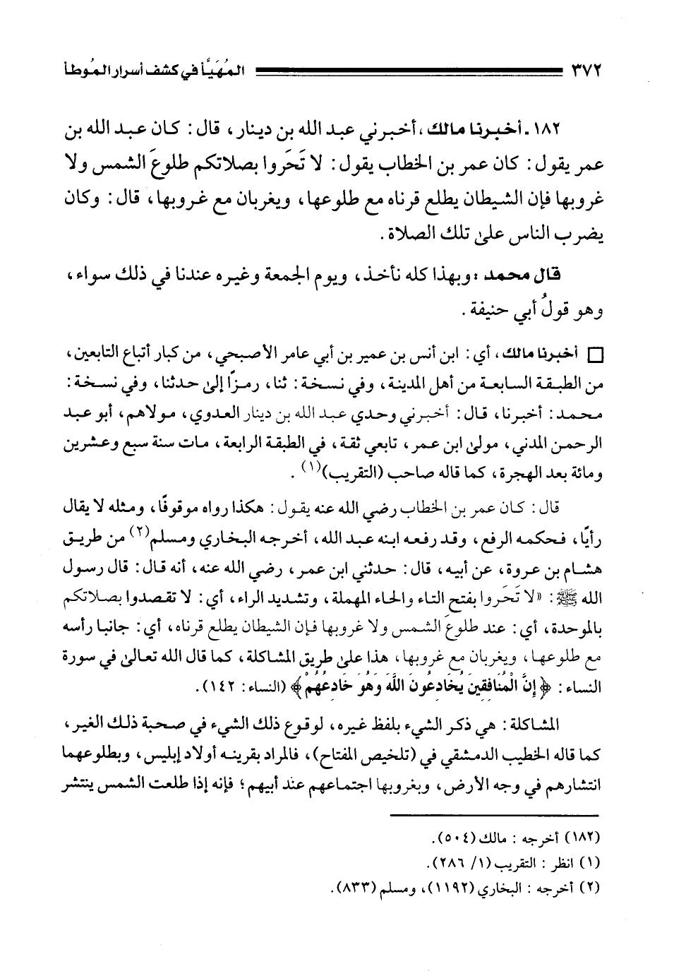 182 - أخبرنا مالك، أخبرني عبد الله بن دينار، قال: كان عبد الله بن عمر يقول: كان عمر بن الخطاب يقول: لا تَحَروا بصلاتكم طلوعَ الشمس ولا غروبها فإن الشيطان يطلع قرناه مع طلوعها، ويغربان مع غروبها، قال: وكان يضرب الناس على تلك الصلاة.
