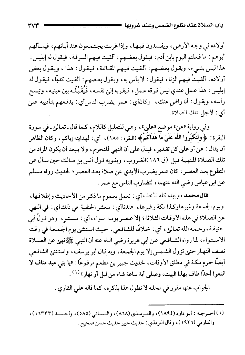 وفي رواية "عن" موضع "على"، وهي للتعليل كاللام، كما قال - تعالى - في سورة البقرة: {وَلِتُكَبِّرُوا اللَّهَ عَلَى مَا هَدَاكُمْ} [البقرة: 185]، أي: لهدايته إياكم، وكان الظاهر أن يقال: عن أو على كل تقدير، فيدل على أن النهي للتحريم، ولا يبعد أن يكون المراد من تلك الصلاة المنهية قبل (ق 186) الغروب، ويقويه قول أنس بن مالك حين سأل عن التطوع بعد العصر: كان عمر يضرب الأيدي عن صلاة بعد العصر؛ لحديث رواه مسلم عن ابن عباس رضي الله عنهما، لتضارب الناس مع عمر.