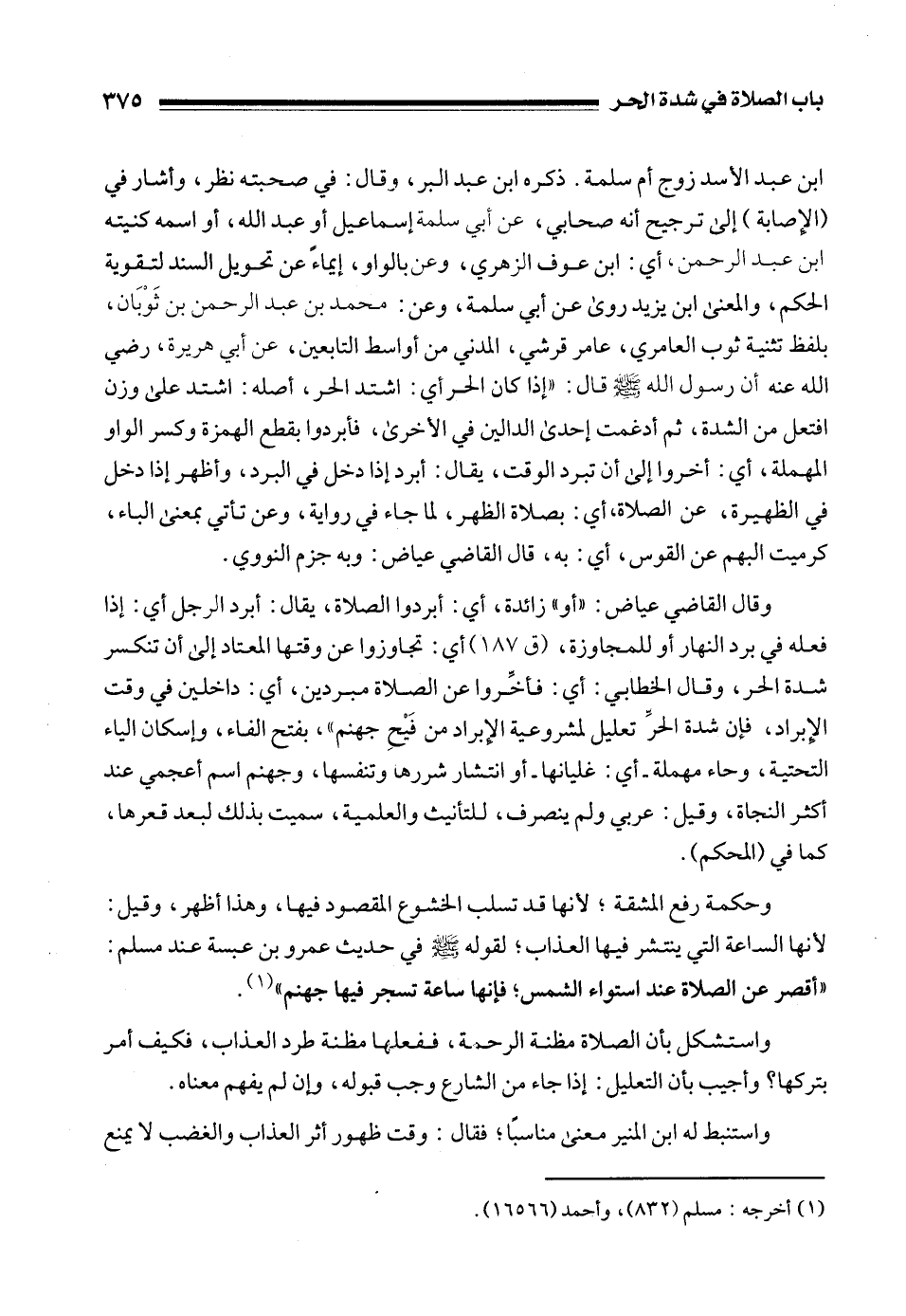 وقال القاضي عياض: "أو" زائدة، أي: أبردوا الصلاة، يقال: أبرد الرجل أي: إذا فعله في برد النهار أو للمجاوزة، (ق 187) أي: تجاوزوا عن وقتها المعتاد إلى أن تنكسر شدة الحر، وقال الخطابي: أي: فأخِّروا عن الصلاة مبردين، أي: داخلين في وقت الإِبراد، فإن شدة الحرِّ تعليل لمشروعية الإِبراد من فَيْحِ جهنم"، بفتح الفاء، وإسكان الياء التحتية، وحاء مهملة - أي: غليانها - أو انتشار شررها وتنفسها، وجهنم اسم أعجمي عند أكثر النجاة، وقيل: عربي ولم ينصرف، للتأنيث والعلمية، سميت بذلك لبعد قعرها، كما في (المحكم).