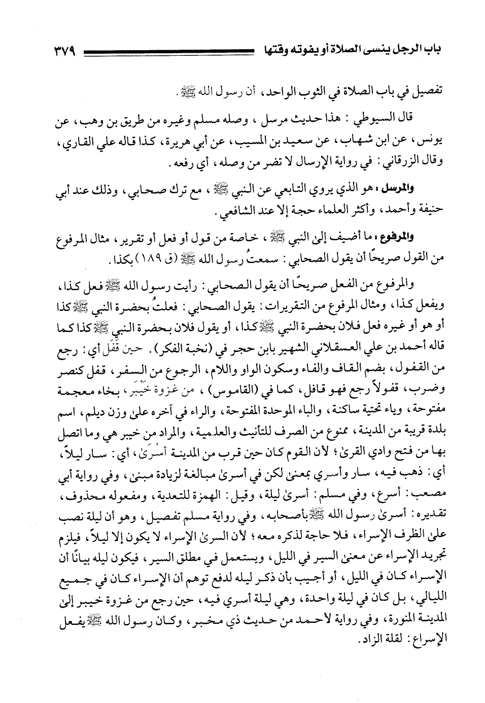 والمرفوع من الفعل صريحًا أن يقول الصحابي: رأيت رسول الله - صلى الله عليه وسلم - فعل كذا، ويفعل كذا، ومثال المرفوع من التقريرات: يقول الصحابي: فعلتُ بحضرة النبي - صلى الله عليه وسلم - كذا أو هو أو غيره فعل فلان بحضرة النبي - صلى الله عليه وسلم - كذا، أو يقول فلان بحضرة النبي - صلى الله عليه وسلم - كذا كما قاله أحمد بن علي العسقلاني الشهير بابن حجر في (نخبة الفكر). ص قَفَل أي: رجع من القفول، بضم القاف والفاء وسكون الواو واللام، الرجوع من السفر، قفل كنصر وضرب، قفولًا رجع فهو قافل، كما في (القاموس)، من غزوة خَيْبَر، بخاء معجمة مفتوحة، وياء تحتية ساكنة، والباء الموحدة المفتوحة، والراء في آخره على وزن ديلم، اسم بلدة قريبة من المدينة، ممنوع من الصرف للتأنيث والعلمية، والمراد من خيبر هي وما اتصل بها من فتح وادي القرى؛ لأن القوم كان حين قرب من المدينة أسْرَى، أي: سار ليلًا، أي: ذهب فيه، سار وأسري بمعنى لكن في أسرى مبالغة لزيادة مبنى، وفي رواية أبي مصعب: أسرع، وفي مسلم: أسرى ليلة، وقيل: الهمزة للتعدية، ومفعوله محذوف، تقديره: أسرى رسول الله - صلى الله عليه وسلم - بأصحابه، وفي رواية مسلم تفصيل، وهو أن ليلة نصب على الظرف الإِسراء، فلا حاجة لذكره معه؛ لأن السرى الإِسراء لا يكون إلا ليلًا، فيلزم تجريد الإِسراء عن معنى السير في الليل، ويستعمل في مطلق السير، فيكون ليله بيانًا أن الإِسراء كان في الليل، أو أجيب بأن ذكر ليله لدفع توهم أن الإِسراء كان في جميع الليالي، بل كان في ليلة واحدة، وهي ليلة أسري فيه، حين رجع من غزوة خيبر إلى المدينة المنورة، وفي رواية لأحمد من حديث ذي مخبر، وكان رسول الله - صلى الله عليه وسلم - يفعل الإِسراع: لقلة الزاد.