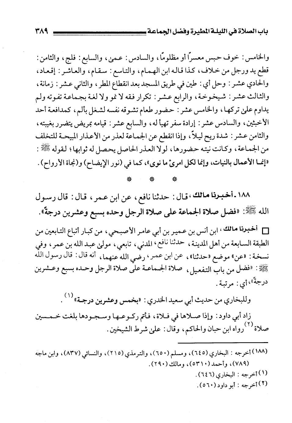 188 - أخبرنا مالك، قال: حدثنا نافع، عن ابن عمر، قال: قال رسول الله - صلى الله عليه وسلم -: "فضل صلاة الجماعة على صلاة الرجل وحده بسبع وعشرين درجةً".