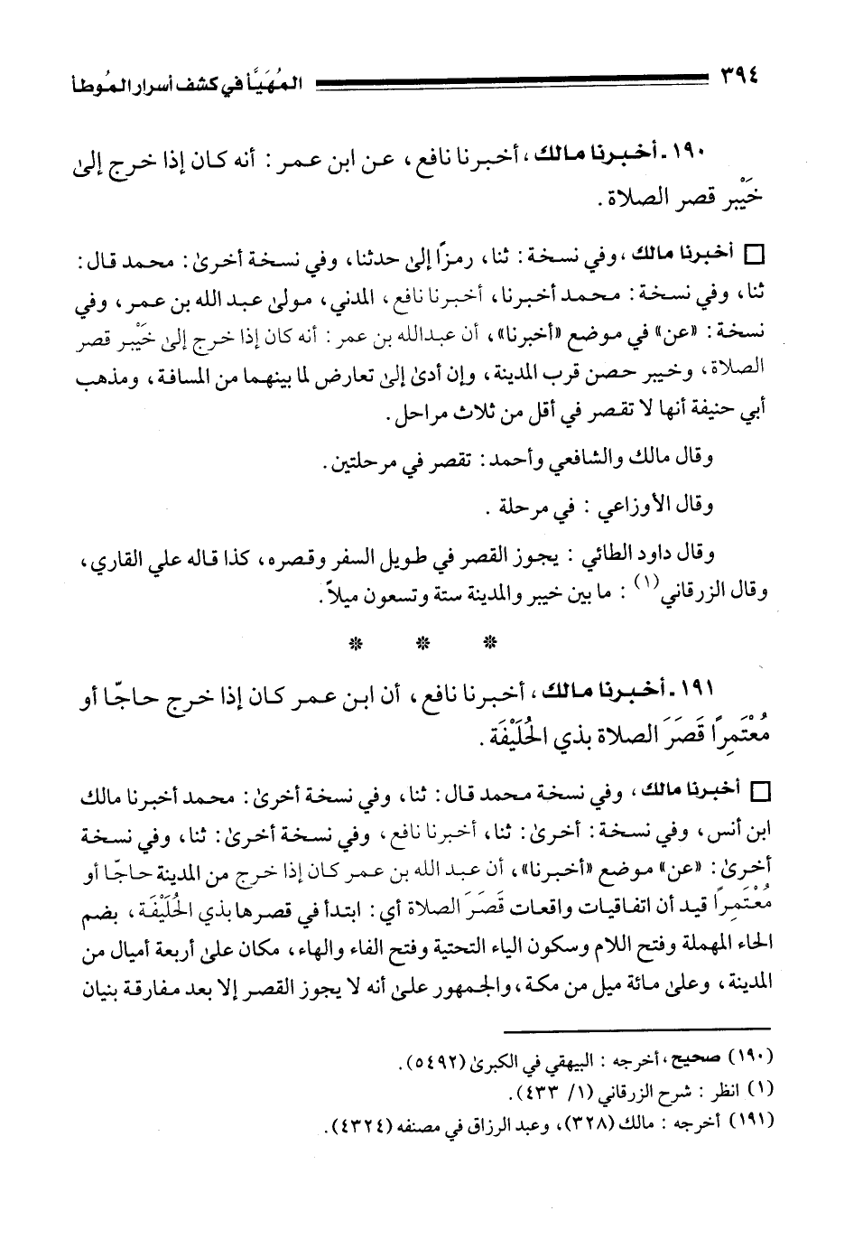 • أخبرنا مالك، وفي نسخة: ثنا، رمزًا إلى حدثنا، وفي نسخة أخرى: محمد قال: ثنا، وفي نسخة: محمد أخبرنا، أخبرنا نافع، المدني، مولى عبد الله بن عمر، وفي نسخة: "عن" في موضع "أخبرنا"، أن عبدالله بن عمر: أنه كان إذا خرج إلى خَيْبر قصر الصلاة، وخيبر حصن قرب المدينة، وإن أدى إلى تعارض لما بينهما من المسافة، ومذهب أبي حنيفة أنها لا تقصر في أقل من ثلاث مراحل.