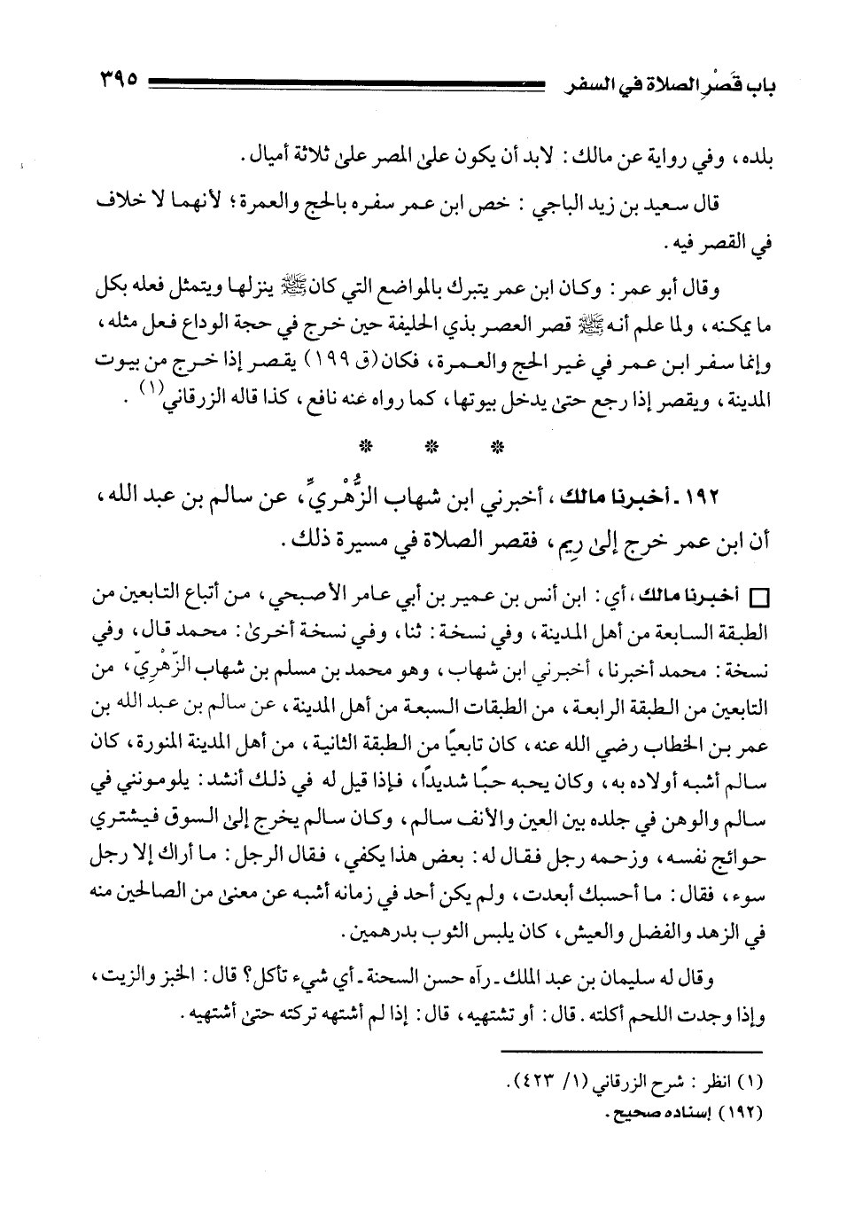 192 - أخبرنا مالك، أخبرني ابن شهاب الزُّهْريِّ، عن سالم بن عبد الله، أن ابن عمر خرج إلى رِيم، فقصر الصلاة في مسيرة ذلك.
