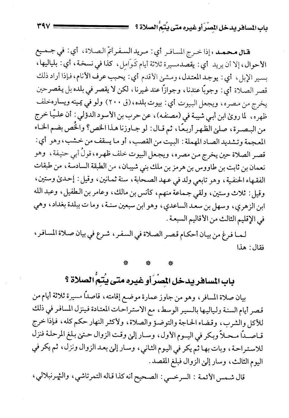 قال محمد: إذا خرج المسافر أي: مريد السفر أتمّ الصلاة، أي: في جميع الأحوال، إلا أن يريد أي: يقصد مسيرة ثلاثة أيام كَوَامِل، كذا في نسخة، أي: بلياليها، بسير الإِبل، أي: يوجد المعتدل، ومشى الأقدم أي: يحبب عرف الأنام، فإذا أراد ذلك قصر الصلاة أي: وجوبًا عندنا، وجوازًا عند غيرنا، لكن لا يقصر في بلده بل يقصر حين يخرج من مصره، ويجعل البيوت أي: بيوت بلده، (ق 200) ولو في يمينه ويساره خلف ظهره، لما روى ابن أبي شيبة في (مصنفه)، عن حرب بن الأسود الدؤلي: أن عليّا خرج من البصرة، صلى الظهر أربعًا، ثم قال: لو جاوزنا هذا الخص؟ والخُص بضم الخاء المعجمة وتشديد الصاد المهملة: البيت من القصب، أو ما يسقف من خشب، وهو أي: قصر الصلاة حين يخرج من مصره، ويجعل البيوت خلف ظهره، قولُ أبي حنيفة، وهو نعمان بن ثابت بن طاووس بن هرمز بن ملك بني شيبان، من الطبقة السادسة، من طبقات الفقهاء الحنفية، وهو تابعي ولد في عهد الصحابة، سنة ثمانين، وقيل: إحدى وستين، وقيل: ثلاث وستين، ولقي جماعة منهم، كأنس بن مالك، وعامر بن الطفيل، وعبد الله بن الزهري، وسهل بن سعد الساعدي، وهو ابن سبعين سنة، ومات ببلدة بغداد، وهي في الإِقليم الثالث من الأقاليم السبعة.