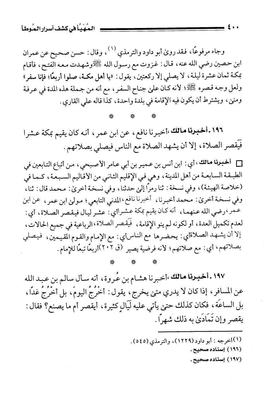 • أخبرنا مالك، أي: ابن أنس بن عمير بن أبي عامر الأصبحي، من أتباع التابعين في الطبقة السابعة من أهل المدينة، وهي في الإِقليم الثاني من الأقاليم السبعة، كما في (خلاصة الهيئة)، وفي نسخة: ثنا رمزًا إلى حدثنا، وفي نسخة أخرى: محمد قال: ثنا، وفي نسخة أخرى: محمد أخبرنا، أخبرنا نافع، المدني التابعي؛ مولى ابن عمر، عن ابن عمر، رضي الله عنهما، أنه كان يقيم بمكة عشرا أي: عشر ليال فيقصر الصلاة، أي: لعدم تكميل العدة، أو لكونه لم ينو الإِقامة، فَيَقصر الصلاة، الرباعية في جميع الحالات، إلا أن يشهد الصلاة أي: يحضرها مع الناس أي: مع الإِمام والقوم المقيمين، فيصلي بصلاتهم، أي: مع صلاتهم؛ لأنه فرضية يصير (ق 202) أربعًا تبعًا للإِمام.