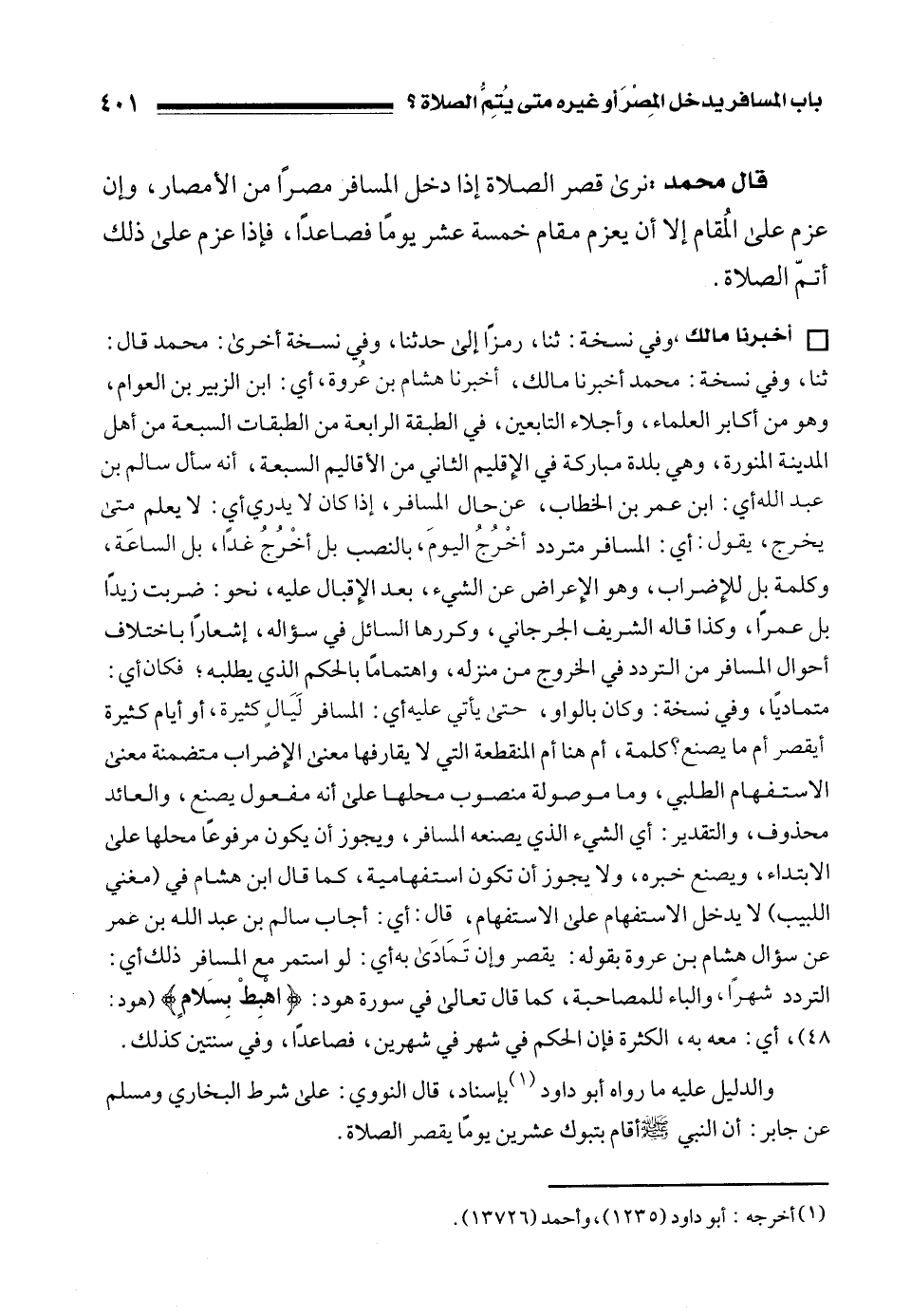 • أخبرنا مالك، وفي نسخة: ثنا، رمزًا إلى حدثنا، وفي نسخة أخرى: محمد قال: ثنا، وفي نسخة: محمد أخبرنا مالك، أخبرنا هشام بن عُروة، أي: ابن الزبير بن العوام، وهو من أكابر العلماء، وأجلاء التابعين، في الطبقة الرابعة من الطبقات السبعة من أهل المدينة المنورة، وهي بلدة مباركة في الإِقليم الثاني من الأقاليم السبعة، أنه سأل سالم بن عبد الله أي: ابن عمر بن الخطاب، عن حال المسافر، إذا كان لا يدري أي: لا يعلم متى يخرج، يقول: أي: المسافر متردد أخْرُجُ اليومَ، بالنصب بل أخْرُجُ غدًا، بل الساعَة، وكلمة بل للإِضراب، وهو الإِعراض عن الشيء، بعد الإِقبال عليه، نحو: ضربت زيدًا بل عمرًا، وكذا قاله الشريف الجرجاني، وكررها السائل في سؤاله، إشعارًا باختلاف أحوال المسافر من التردد في الخروج من منزله، واهتمامًا بالحكم الذي يطلبه؛ فكان أي: متماديًا، وفي نسخة: وكان بالواو، حتى يأتي عليه أي: المسافر لَيَالٍ كثيرة، أو أيام كثيرة أيقصر أم ما يصنع؟ كلمة، أم هنا أم المنقطعة التي لا يقارفها معنى الإِضراب متضمنة معنى الاستفهام الطلبي، وما موصولة منصوب محلها على أنه مفعول يصنع، والعائد محذوف، والتقدير: أي الشيء الذي يصنعه المسافر، ويجوز أن يكون مرفوعًا محلها على الابتداء، ويصنع خبره، ولا يجوز أن تكون استفهامية، كما قال ابن هشام في (مغني اللبيب) لا يدخل الاستفهام على الاستفهام، قال: أي: أجاب سالم بن عبد الله بن عمر عن سؤال هشام بن عروة بقوله: يقصر وإن تَمَادَى به أي: لو استمر مع المسافر ذلك أي: التردد شهرًا، والباء للمصاحبة، كما قال تعالى في سورة هود: {اهْبِطْ بِسَلَامٍ} [هود: 48]، أي: معه به، الكثرة فإن الحكم في شهر في شهرين، فصاعدًا، وفي سنتين كذلك.