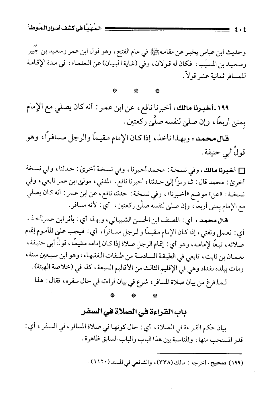 199 - أخبرنا مالك، أخبرنا نافع، عن ابن عمر: أنه كان يصلي مع الإِمام بِمنى أربعًا، وإن صلى لنفسه صلَّى ركعتين.