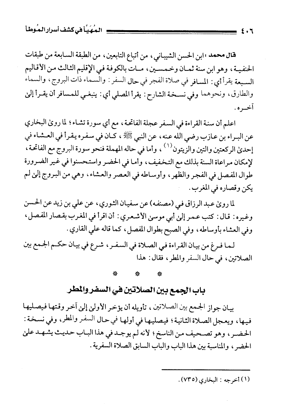 قال محمد: ابن الحسن الشيباني، من أتباع التابعين، من الطبقة السابعة من طبقات الحنفية، وهو ابن سنة ثمان وخمسين، مات بالكوفة في الإِقليم الثالث من الأقاليم السبعة يقرأ أي: المسافر في صلاة الفجر في حال السفر: والسماء ذات البروج، والسماء والطارق، ونحوهما وفي نسخة الشارح: يقرأ المصلي أي: ينبغي للمسافر أن يقرأ إلى آخره.