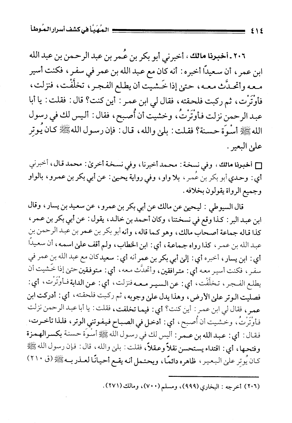 206 - أخبرنا مالك، أخبرني أبو بكر بن عُمر بن عبد الرحمن بن عبد الله بن عمر، أن سعيدًا أخبره: أنه كان مع عبد الله بن عمر في سفر، فكنت أسير معه وأتحدَّث معه، حتى إذا خَشيت أن يطلع الفجر، تخلَّفْت، فنزلت، فأوْتَرْت، ثم ركبت فلحقته، فقال لي ابن عمر: أين كنت؟ قال: فقلت: يا أبا عبد الرحمن نزلت فأوْتَرْتُ، وخشيت أن أُصبح، فقال: أليس لك في رسول الله - صلى الله عليه وسلم - أسْوَة حسنة؟ فقلت: بلى والله، قال: فإن رسول الله - صلى الله عليه وسلم - كان يُوتِر على البعير.
