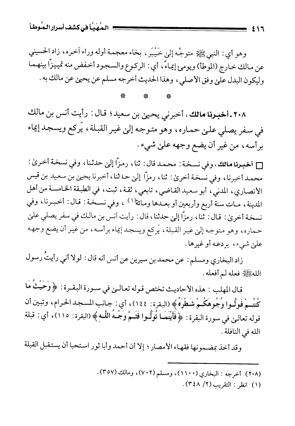 • أخبرنا مالك، وفي نسخة: محمد قال: ثنا، رمزًا إلى حدثنا، وفي نسخة أخرى: محمد أخبرنا، وفي نسخة أخرى: ثنا، رمزًا إلى حدثنا، أخبرنا يحيى بن سعيد بن قيس الأنصاري، المدني، أبو سعيد القاضي، تابعي، ثقة، ثبت، في الطبقة الخامسة من أهل المدينة، مات سنة أربع وأربعين أو بعدها ومائة (¬1)، وفي نسخة: قال: أخبرنا، وفي نسخة أخرى: قال: ثنا، رمزًا إلى حدثنا، قال: رأيت أنس بن مالك في سفر يصلي على حماره، وهو متوجه إلى غير القبلة، يَركع ويسجد إيماء برأسه، من غير أن يضع وجهه على شيء، بردعه أو غيرها.