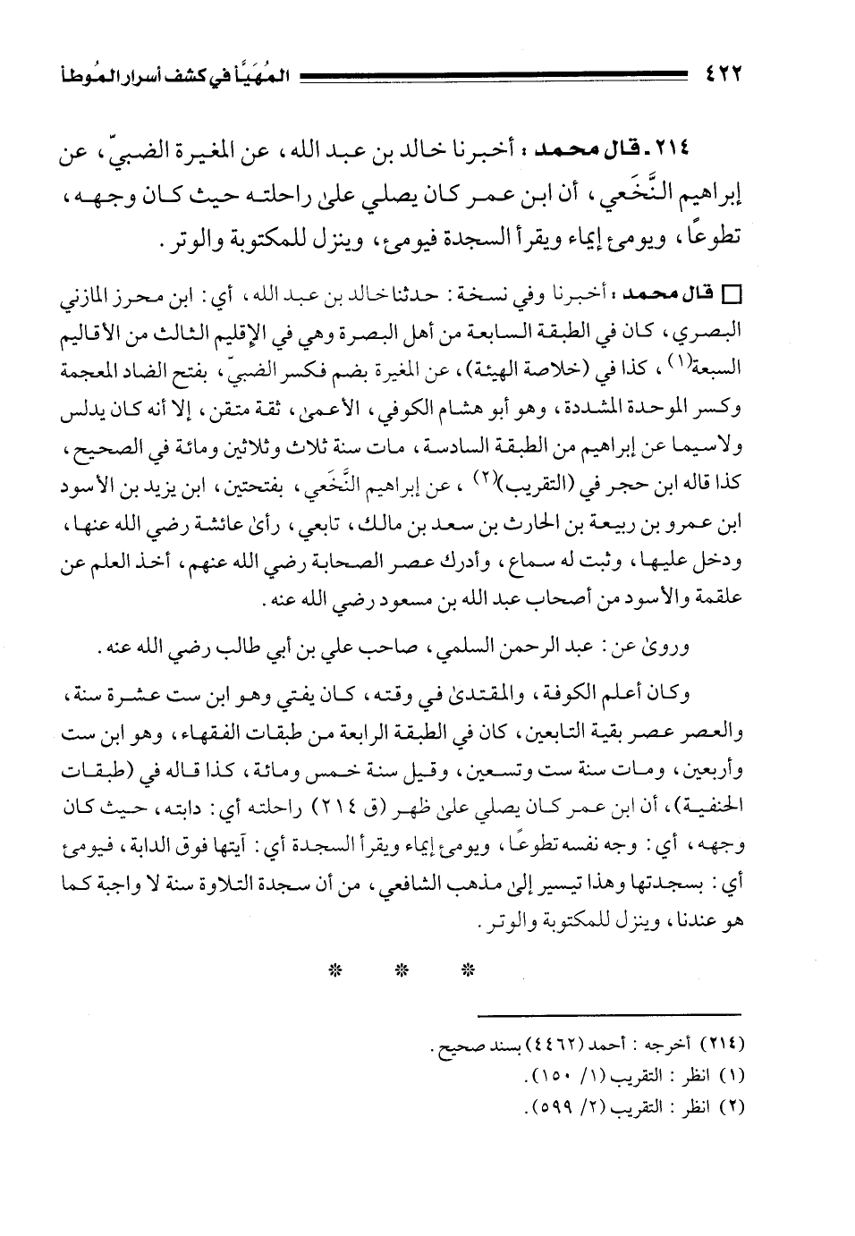 214 - قال محمد: أخبرنا خالد بن عبد الله، عن المغيرة الضبيّ، عن إبراهيم النَّخَعي، أن ابن عمر كان يصلي على راحلته حيث كان وجهه، تطوعًا، ويومئ إيماء ويقرأ السجدة فيومئ، وينزل للمكتوبة والوتر.