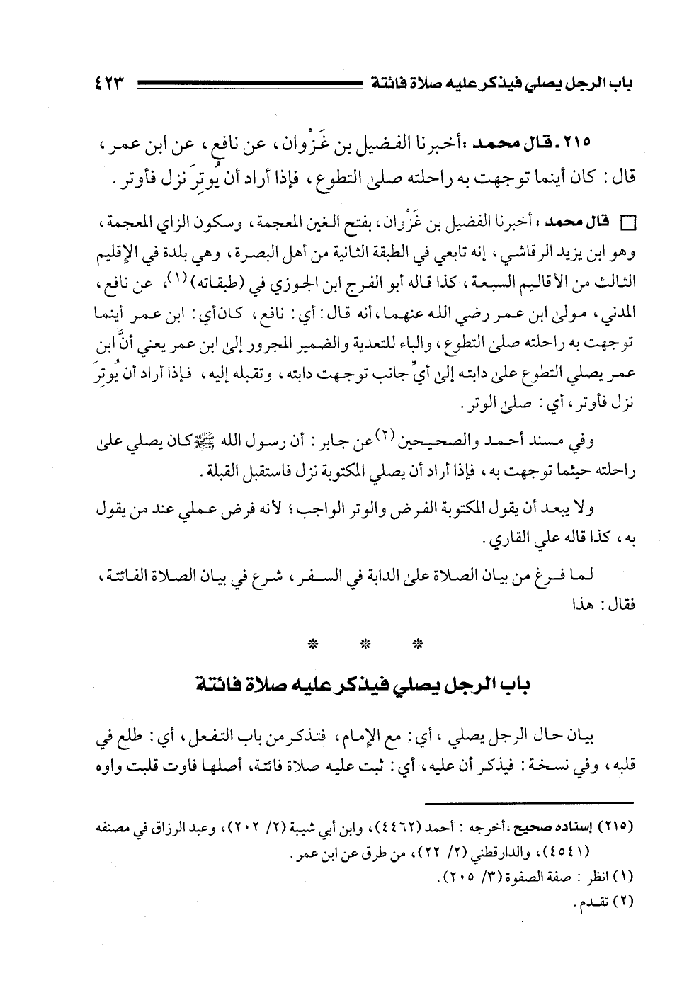 215 - قال محمد: أخبرنا الفضيل بن غَزْوان، عن نافع، عن ابن عمر، قال: كان أينما توجهت به راحلته صلى التطوع، فإذا أراد أن يُوتِرَ نزل فأوتر.