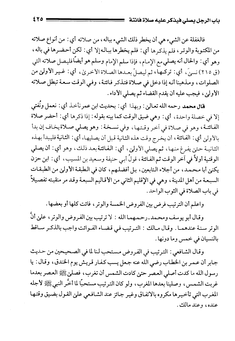 وقال أبو يوسف ومحمد - رحمهما الله: لا ترتيب بين الفروض والوتر، على أنَّ الوتر سنة عندهما. وقال مالك: الترتيب في قضاء الفوائت واجب بالذكر ساقط بالنسيان في خمس وما دونها.