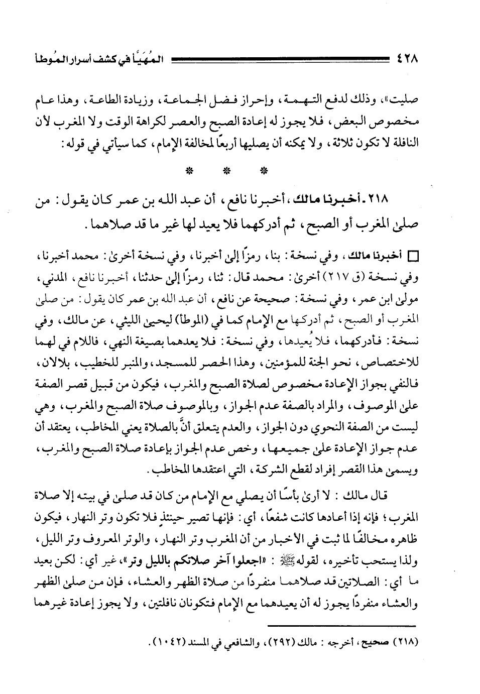 • أخبرنا مالك، وفي نسخة: بنا، رمزًا إلى أخبرنا، وفي نسخة أخرى: محمد أخبرنا، وفي نسخة (ق 217) أخرى: محمد قال: ثنا، رمزًا إلى حدثنا، أخبرنا نافع، المدني، مولى ابن عمر، وفي نسخة: صحيحة عن نافع، أن عبد الله بن عمر كان يقول: من صلى المغرب أو الصبح، ثم أدركها مع الإِمام كما في (الموطأ) ليحيى الليثي، عن مالك، وفي نسخة: فأدركهما، فلا يُعيدها، وفي نسخة: فلا يعدهما بصيغة النهي، فاللام في لهما للاختصاص، نحو الجنة للمؤمنين، وهذا الحصر للمسجد، والمنبر للخطيب، بلالان، فالنفي بجواز الإِعادة مخصوص لصلاة الصبح والمغرب، فيكون من قبيل قصر الصفة على الموصوف، والمراد بالصفة عدم الجواز، وبالموصوف صلاة الصبح والمغرب، وهي ليست من الصفة النحوي دون الجواز، والعدم يتعلق أنَّ بالصلاة يعني المخاطب، يعتقد أن عدم جواز الإِعادة على جميعها، وخص عدم الجواز بإعادة صلاة الصبح والمغرب، ويسمى هذا القصر إفراد لقطع الشركة، التي اعتقدها المخاطب.