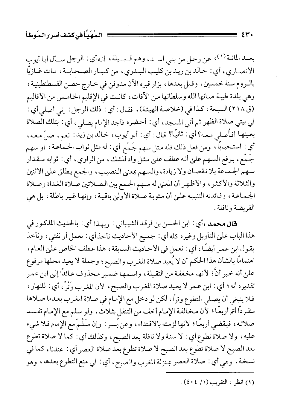 بعد المائة (¬1)، عن رجل من بني أسد، وهم قبيلة، أنه أي: الرجل سأل أبا أيوب الأنصاري، أي: خالد بن زيد بن كليب البدري، من كبار الصحابة، مات غازيًا بالروم سنة خمسين، وقيل بعدها، يزار قبره الآن مدفون في خارج حصن القسطنطينية، وهي بلدة طيبة صانها الله وسلطانها من الآفات، كانت في الإِقليم الخامس من الأقاليم (ق 218) السبعة، كذا في (خلاصة الهيئة)، فقال: أي: ذلك الرجل: إني أصلي أي: في بيتي صلاة الظهر ثم آتي المسجد، أي: أحضره فأجد الإِمام يصلي، أي: بتلك الصلاة بعينها أفأُصلي معه؟ أي: ثانيًا؟ قال: أي: أبو أيوب، خالد بن زيد: نعم، صلّ معه، أي: استحبابًا، ومن فعل ذلك فله مثل سهم جَمْع أي: له مثل ثواب الجماعة، أو سهم جَمْع، برفع السهم على أنه عطف على مثل واد للشك، من الراوي، أي: ثوابه مقدار سهم الجماعة بلا نقصان ولا زيادة، والسهم بمعنى النصيب، والجمع يطلق على الاثنين والثلاثة والأكثر، والأظهر أن المعنى له سهم الجمع بين الصلاتين صلاة الغداة وصلاة الجماعة، وفائدته التنبيه على أن مثوبة صلاة الأولى باقية، وإنها غير باطلة، بل هي الفريضة ونافلة.