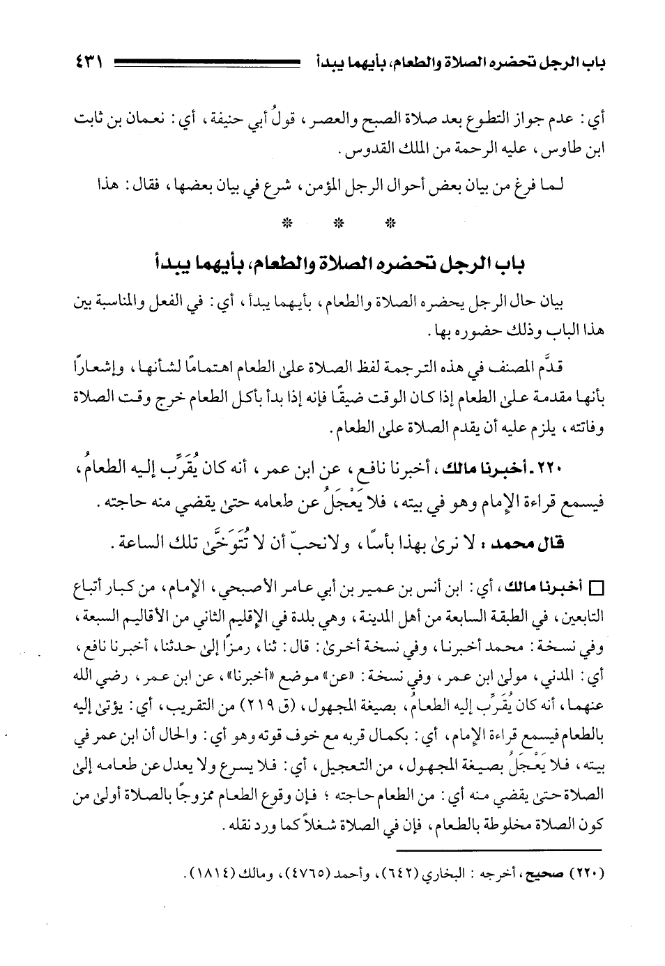 220 - أخبرنا مالك، أخبرنا نافع، عن ابن عمر، أنه كان يُقَرِّب إليه الطعامُ، فيسمع قراءة الإِمام وهو في بيته، فلا يَعْجَلُ عن طعامه حتى يقضي منه حاجته.