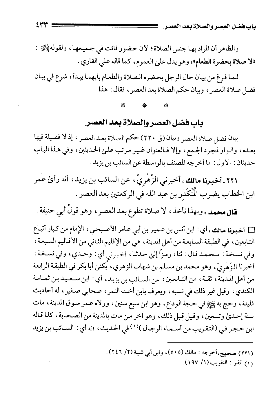 221 - أخبرنا مالك، أخبرني الزُّهْرِيّ، عن السائب بن يزيد، أنه رأى عمر بن الخطاب يضرب المُنْكَدِر بن عبد الله في الركعتين بعد العصر.