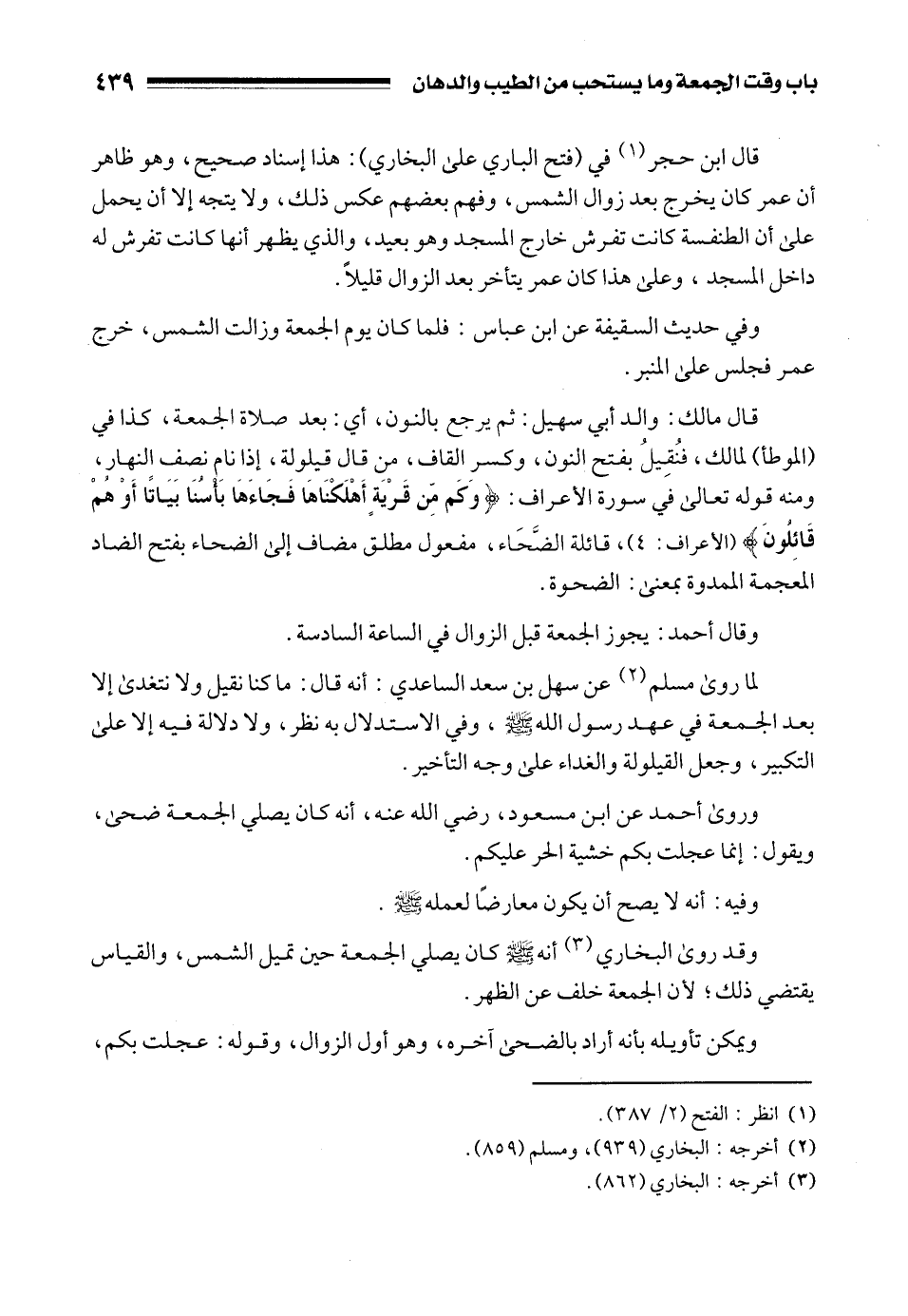 قال ابن حجر (¬1) في (فتح الباري على البخاري): هذا إسناد صحيح، وهو ظاهر أن عمر كان يخرج بعد زوال الشمس، وفهم بعضهم عكس ذلك، ولا يتجه إلا أن يحمل على أن الطنفسة كانت تفرش خارج المسجد وهو بعيد، والذي يظهر أنها كانت تفرش له داخل المسجد، وعلى هذا كان عمر يتأخر بعد الزوال قليلًا.