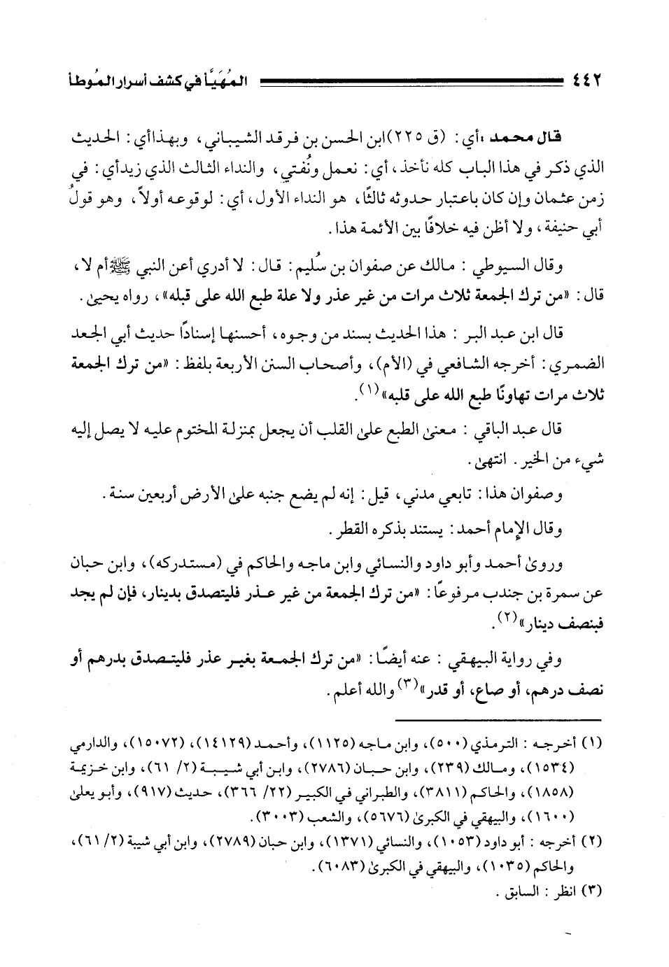 وقال السيوطي: مالك عن صفوان بن سُليم: قال: لا أدري أعن النبي - صلى الله عليه وسلم - أم لا، قال: "من ترك الجمعة ثلاث مرات من غير عذر ولا علة طبع الله على قلبه"، رواه يحيى.