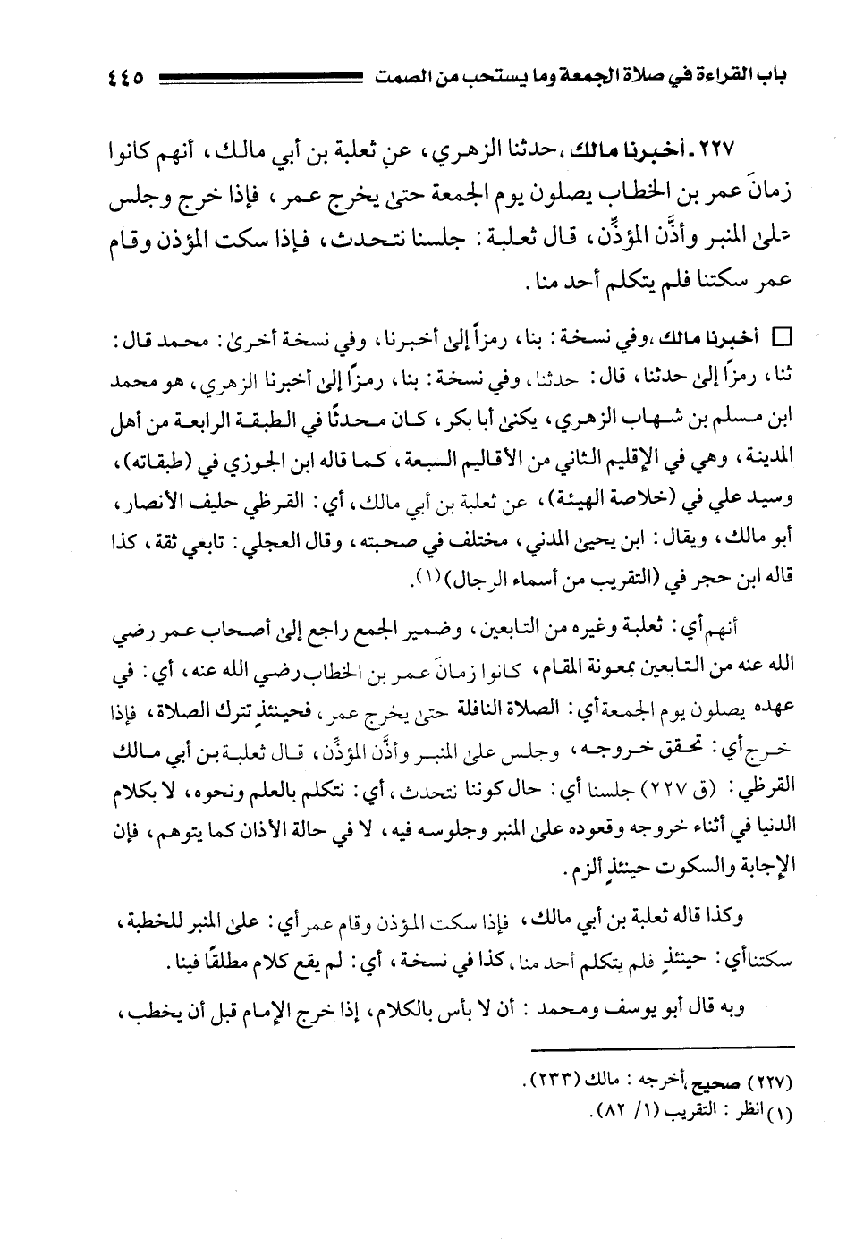 227 - أخبرنا مالك، حدثنا الزهري، في ثعلبة بن أبي مالك، أنهم كانوا زمانَ عمر بن الخطاب يصلون يوم الجمعة حتى يخرج عمر، فإذا خرج وجلس على المنبر وأذن المؤذِّن، قال ثعلبة: جلسنا نتحدث، فإذا سكت المؤذن وقام عمر سكتنا فلم يتكلم أحد منا.