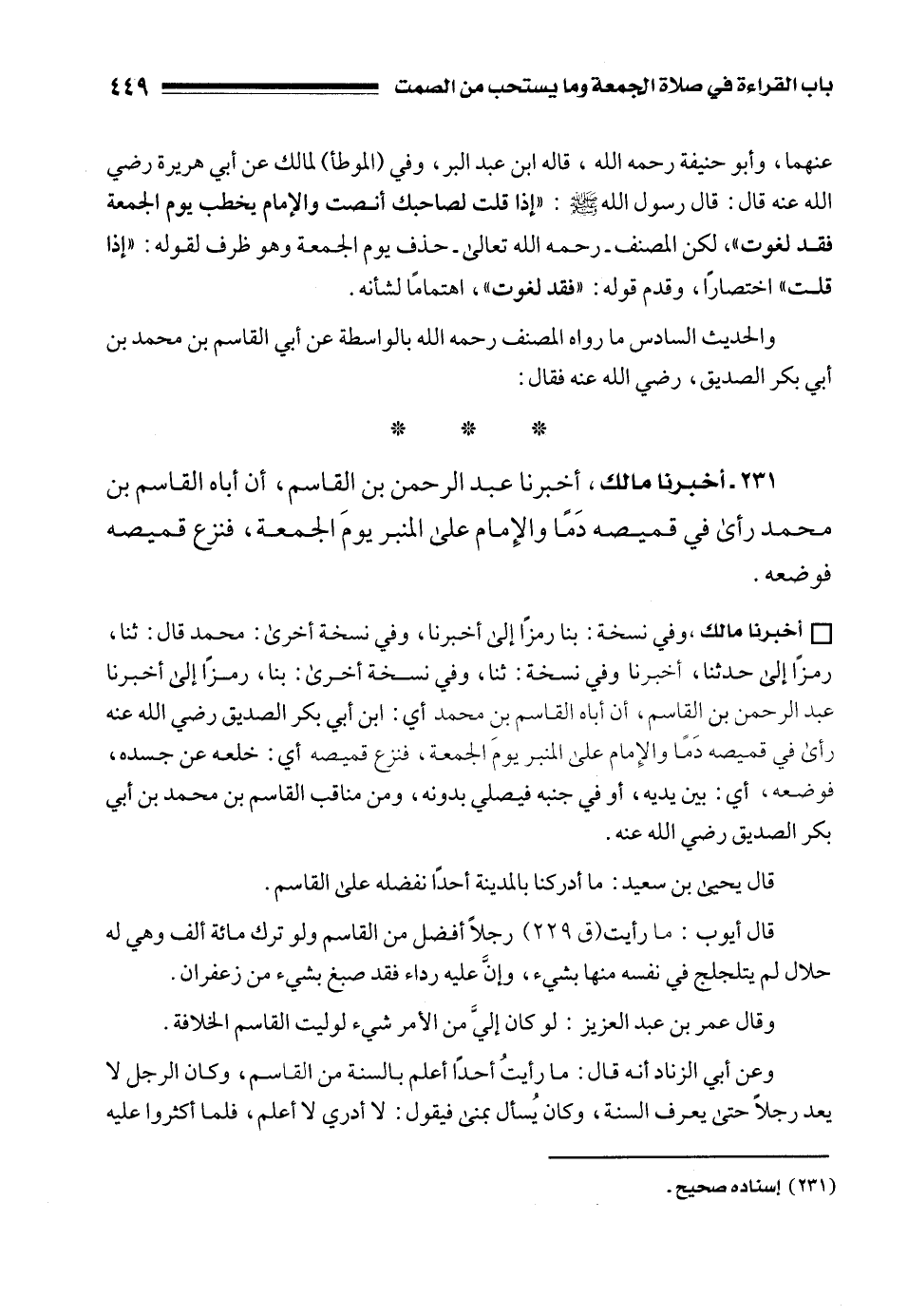 • أخبرنا مالك، وفي نسخة: بنا رمزًا إلى أخبرنا، وفي نسخة أخرى: محمد قال: ثنا، رمزًا إلى حدثنا، أخبرنا وفي نسخة: ثنا، وفي نسخة أخرى: بنا، رمزًا إلى أخبرنا عبد الرحمن بن القاسم، أن أباه القاسم بن محمد أي: ابن أبي بكر الصديق رضي الله عنه رأى في قميصه دَمًا والإِمام على المنبر يومَ الجمعة، فنزع قميصه أي: خلعه عن جسده، فوضعه، أي: بين يديه، أو في جنبه فيصلي بدونه، ومن مناقب القاسم بن محمد بن أبي بكر الصديق رضي الله عنه.