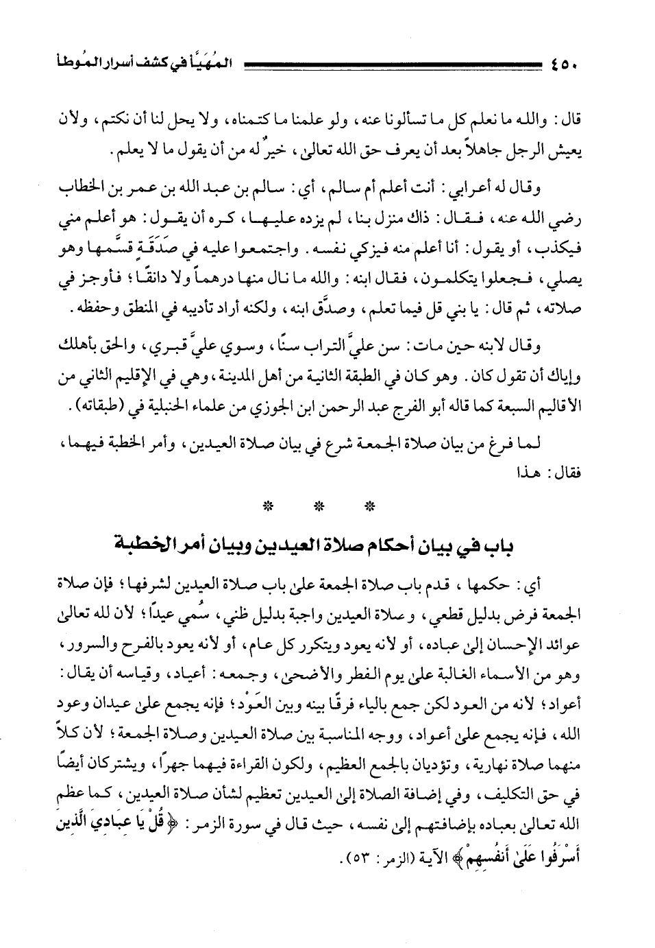 أي: حكمها، قدم باب صلاة الجمعة على باب صلاة العيدين لشرفها؛ فإن صلاة الجمعة فرض بدليل قطعي، وصلاة العيدين واجبة بدليل ظني، سُمي عيدًا؛ لأن لله تعالى عوائد الإِحسان إلى عباده، أو لأنه يعود ويتكرر كل عام، أو لأنه يعود بالفرح والسرور، وهو من الأسماء الغالبة على يوم الفطر والأضحى، وجمعه: أعياد، وقياسه أن يقال: أعواد؛ لأنه من العود لكن جمع بالياء فرقًا بينه وبين العَوْد؛ فإنه يجمع على عيدان وعود الله، فإنه يجمع على أعواد، ووجه المناسبة بين صلاة العيدين وصلاة الجمعة؛ لأن كلًا منهما صلاة نهارية، وتؤديان بالجمع العظيم، ولكون القراءة فيهما جهرًا، ويشتركان أيضًا في حق التكليف، وفي إضافة الصلاة إلى العيدين تعظيم لشأن صلاة العيدين، كما عظم الله تعالى بعباده بإضافتهم إلى نفسه، حيث قال في سورة الزمر: {قُلْ يَاعِبَادِيَ الَّذِينَ أَسْرَفُوا عَلَى أَنْفُسِهِمْ} الآية [الزمر: 53].