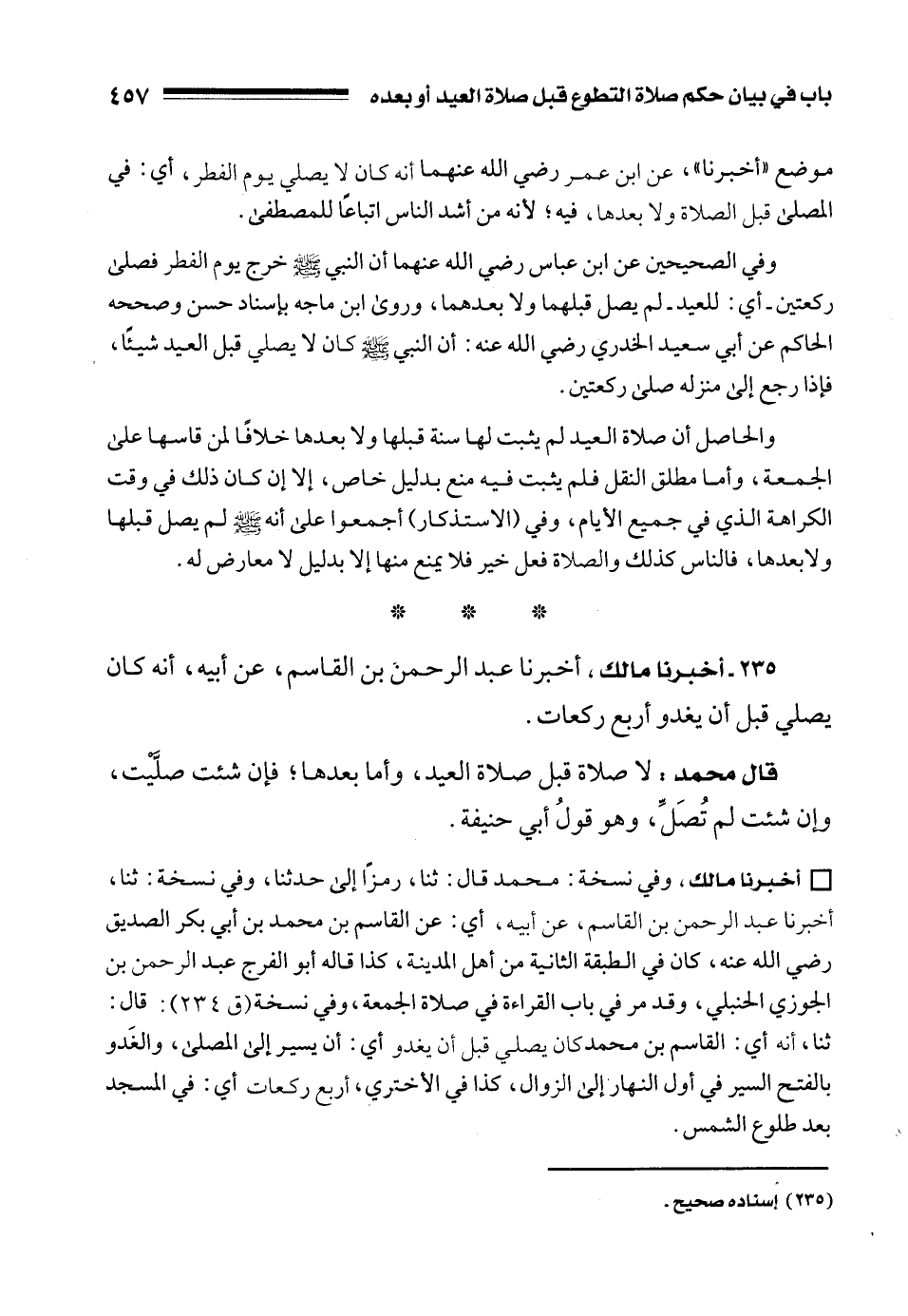 • أخبرنا مالك، وفي نسخة: محمد قال: ثنا، رمزًا إلى حدثنا، وفي نسخة: ثنا، أخبرنا عبد الرحمن بن القاسم، عن أبيه، أي: عن القاسم بن محمد بن أبي بكر الصديق رضي الله عنه، كان في الطبقة الثانية من أهل المدينة، كذا قاله أبو الفرج عبد الرحمن بن الجوزي الحنبلي، وقد مر في باب القراءة في صلاة الجمعة، وفي نسخة (ق 234): قال: ثنا، أنه أي: القاسم بن محمد كان يصلي قبل أن يغدو أي: أن يسير إلى المصلى، والغَدو بالفتح السير في أول النهار إلى الزوال، كذا في الأختري، أربع ركعات أي: في المسجد بعد طلوع الشمس.