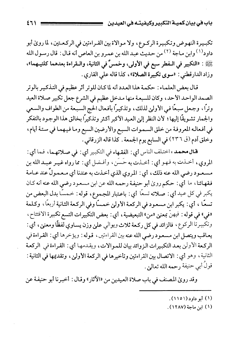 تكبيرة النهوض وتكبيرة الركوع، ولا موالاة بين القراءتين في الركعتين، لما روى أبو داود (¬1) وابن ماجه (¬2) من حديث عبد الله بن عمرو بن العاص أنه قال: قال رسول الله - صلى الله عليه وسلم -: "التكبير في الفطر سبع في الأولى، وخمسٌ في الثانية، والقراءة بعدهما كلتيهما"، وزاد الدارقطني: "سوى تكبيرة الصلاة"، كذا قاله علي القاري.