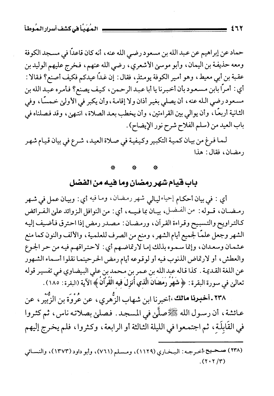 238 - أخبرنا مالك، أخبرنا ابن شهاب الزُّهري، عن عُرْوَة بن الزُّبَيْر، عن عائشة، أن رسول الله - صلى الله عليه وسلم - صلَّى في المسجد. فصلى بصلاته ناس، ثم كثروا في القَابِلَةِ، ثم اجتمعوا في الليلة الثالثة أو الرابعة، وكثروا، فلم يخرج إليهم