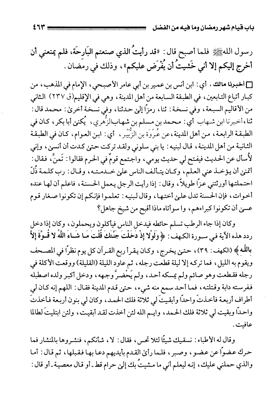 • أخبرنا مالك، أي: ابن أنس بن عمير بن أبي عامر الأصبحي، الإِمام في المذهب، من كبار أتباع التابعين، في الطبقة السابعة من أهل المدينة، وهي في الإِقليم (ق 237) الثاني من الأقاليم السبعة، وفي نسخة: ثنا، رمزًا إلى حدثنا، وفي نسخة أخرى: محمد قال: ثنا، أخبرنا ابن شهاب أي: محمد بن مسلم بن شهاب الزُّهري، يُكنى أبا بكر، كان في الطبقة الرابعة، من أهل المدينة، عن عُرْوَة بن الزُّبَيْر، أي: ابن العوام، كان في الطبقة الثانية من أهل المدينة، قال لبنيه: يا بني سلوني ولقد تركت حتى كدت أن أنسى، وإني لأُسأل عن الحديث فيفتح لي حديث يومي، واجتمع قومٌ في الحرم فقالوا: تَمنَّ، فقال: أتمنى أن يؤخذ عني العلم، وكان يتألف الناس على خدمته، وقال: رب كلمة ذُلّ احتملتها أورثتني عزًا طويلًا، وقال: إذا رأيت الرجل يعمل الحسنة، فاعلم أن لها عنده أخوات، فإن الحسنة تدل على أختها، وقال لبنيه: تعلموا فإنكم إن تكونوا صغار قوم عسى أن تكونوا كبراءهم، واسوأتاه ماذا أقبح من شيخ جاهل؟