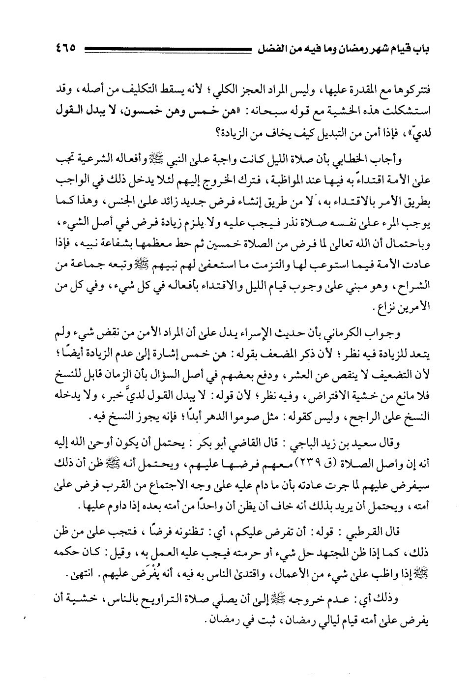 وقال سعيد بن زيد الباجي: قال القاضي أبو بكر: يحتمل أن يكون أوحى الله إليه أنه إن واصل الصلاة (ق 239) معهم فرضها عليهم، ويحتمل أنه - صلى الله عليه وسلم - ظن أن ذلك سيفرض عليهم لما جرت عادته بأن ما دام عليه على وجه الاجتماع من القرب فرض على أمته، ويحتمل أن يريد بذلك أنه خاف أن يظن أن واحدًا من أمته بعده إذا داوم عليها.