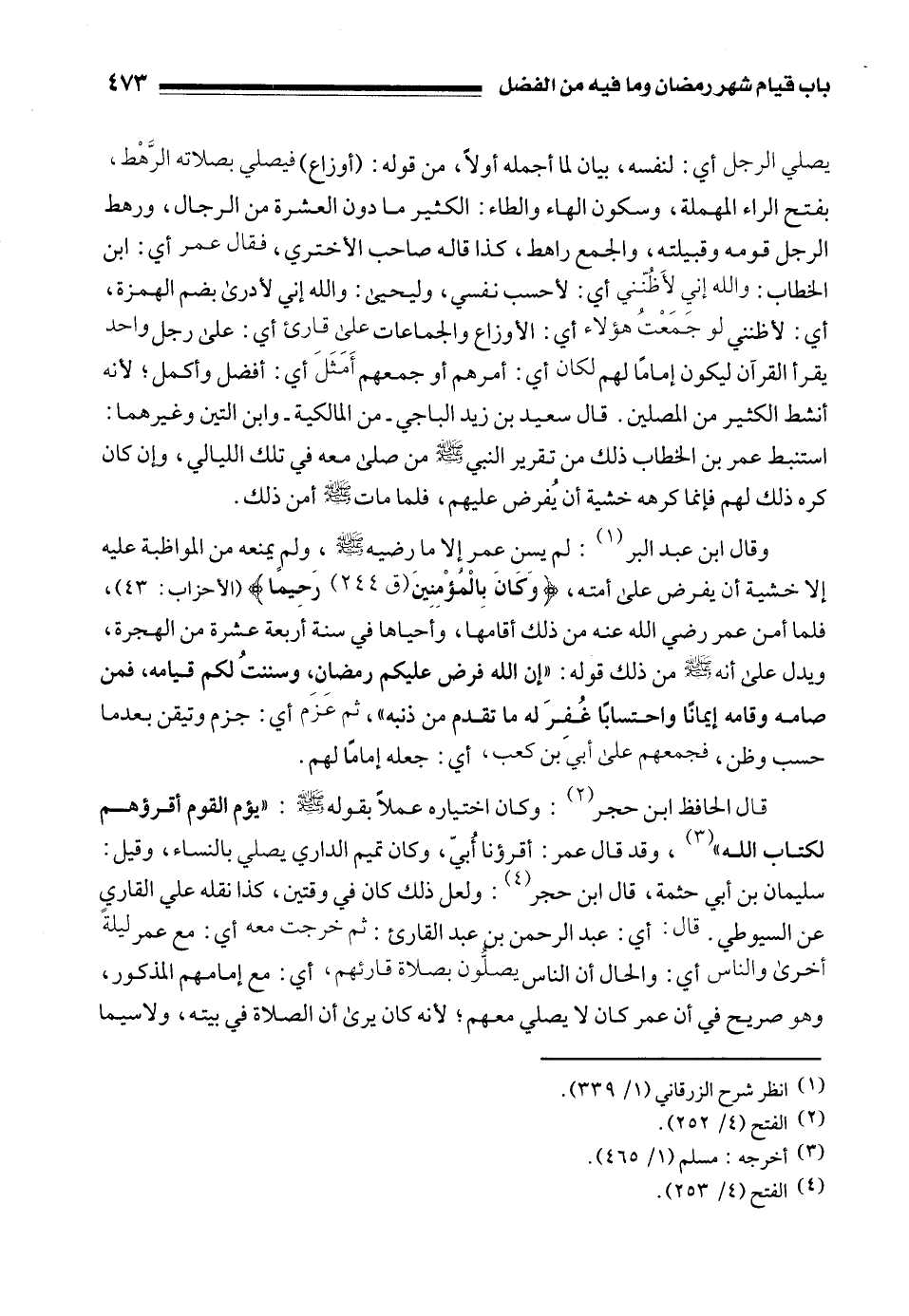 وقال ابن عبد البر (¬1): لم يسن عمر إلا ما رضيه - صلى الله عليه وسلم -، ولم يمنعه من المواظبة عليه إلا خشية أن يفرض على أمته، {وَكَانَ بِالْمُؤْمِنِينَ (ق 244) رَحِيمًا} [الأحزاب: 43]، فلما أمن عمر رضي الله عنه من ذلك أقامها، وأحياها في سنة أربعة عشرة من الهجرة، ويدل على أنه - صلى الله عليه وسلم - من ذلك قوله: "إن الله فرض عليكم رمضان، وسننتُ لكم قيامه، فمن صامه وقامه إيمانًا واحتسابًا غُفِرَ له ما تقدم من ذنبه"، ثم عَزَم أي: جزم وتيقن بعد ما حسب وظن، فجمعهم على أبي بن كعب، أي: جعله إمامًا لهم.