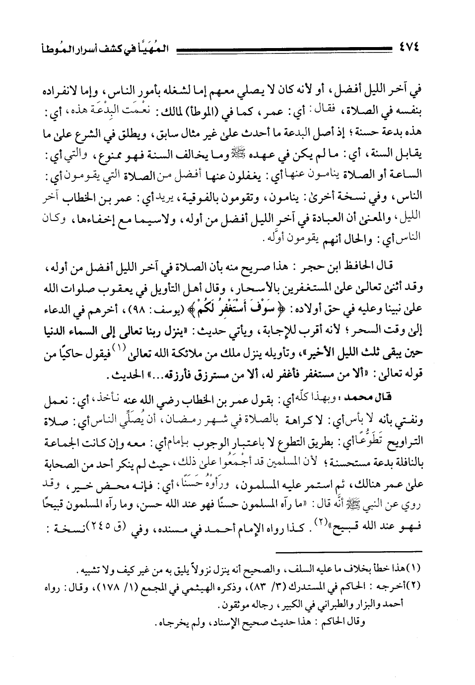 قال محمد: وبهذا كلّه أي: بقول عمر بن الخطاب رضي الله عنه نأخذ، أي: نعمل ونفتي بأنه لا بأس أي: لا كراهة بالصلاة في شهر رمضان، أن يُصَلِّي الناس أي: صلاة التراويح تَطَوُّعًا أي: بطريق التطوع لا باعتبار الوجوب بإمام أي: معه وإن كانت الجماعة بالنافلة بدعة مستحسنة؛ لأن المسلمين قد أجْمَعُوا على ذلك، حيث لم ينكر أحد من الصحابة على عمر هنالك، تم استمر عليه المسلمون، ورَأوْهُ حَسَنًا، أي: فإنه محض خير، وقد روي عن النبي - صلى الله عليه وسلم - أنَّه قال: "ما رآه المسلمون حسنًا فهو عند الله حسن، وما رآه المسلمون قبيحًا فهو عند الله قبيح" (¬2). كذا رواه الإِمام أحمد في مسنده، وفي (ق 245) نسخة: