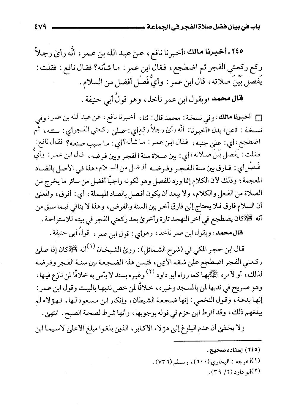 245 - أخبرنا مالك، أخبرنا نافع، عن عبد الله بن عمر، أنَّه رأى رجلًا ركع ركعتي الفجر ثم اضطجع، فقال ابن عمر: ما شأنه؟ فقال نافع: فقلت: يَفصل بَيْنَ صلاته، قال ابن عمر: وأيُّ فَصْل أفضل من السلام.