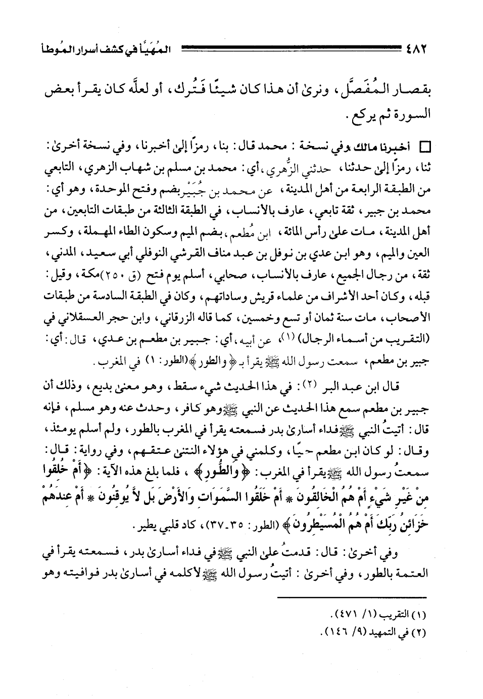 • أخبرنا مالك, وفي نسخة: محمد قال: بنا، رمزًا إلى أخبرنا، وفي نسخة أخرى: ثنا، رمزًا إلى حدثنا، حدثني الزُّهري، أي: محمد بن مسلم بن شهاب الزهري، التابعي من الطبقة الرابعة من أهل المدينة، عن محمد بن جُبَيْر بضم وفتح الموحدة، وهو أي: محمد بن جبير، ثقة تابعي، عارف بالأنساب، في الطبقة الثالثة من طبقات التابعين، من أهل المدينة، مات على رأس المائة، ابن مُطعم، بضم الميم وسكون الطاء المهملة، وكسر العين والميم، وهو ابن عدي بن نوفل بن عبد مناف القرشي النوفلي أبي سعيد، المدني، ثقة، من رجال الجميع، عارف بالأنساب، صحابي، أسلم يوم فتح (ق 250) مكة، وقيل: قبله، وكان أحد الأشراف من علماء قريش وساداتهم، وكان في الطبقة السادسة من طبقات الأصحاب، مات سنة ثمان أو تسع وخمسين، كما قاله الزرقاني، وابن حجر العسقلاني في (التقريب من أسماء الرجال) (¬1)، عن أبيه، أي: جبير بن مطعم بن عدي، قال: أي: جبير بن مطعم، سمعت رسول الله - صلى الله عليه وسلم - يقرأ بـ {وَالطُّورِ} [الطور: 1] في المغرب.