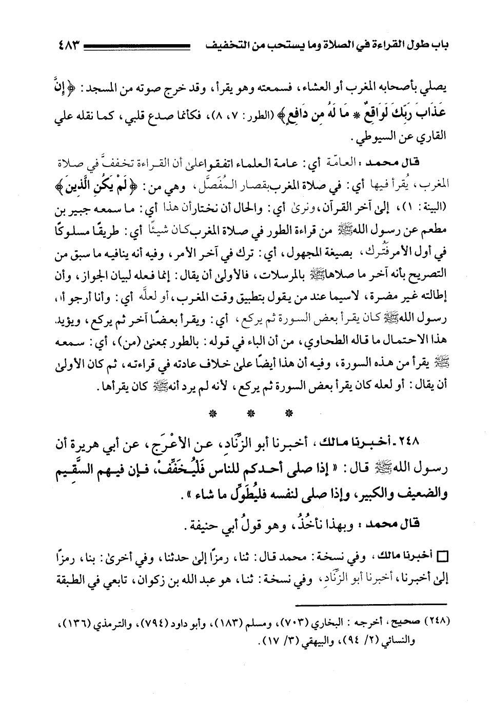 248 - أخبرنا مالك، أخبرنا أبو الزِّنَادِ، عن الأعْرَج، عن أبي هريرة أن رسول الله - صلى الله عليه وسلم - قال: "إذا صلى أحدكم للناس فَلْيُخَفِّفْ، فإن فيهم السَّقِيم والضعيف والكبير، وإذا صلى لنفسه فليُطَوِّل ما شاء".