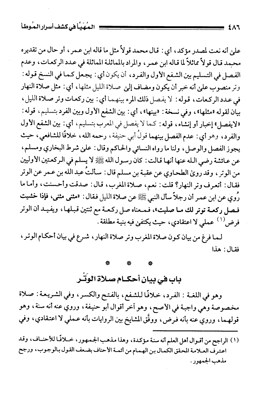 وهو في اللغة: الفرد، خلافًا للشفع، بالفتح والكسر، وفي الشريعة: صلاة مخصوصة وهي واجبة في الأصح، وهو آخر أقوال أبو حنيفة، وروي عنه أنه سنة، وهو قولهما، وروي عنه بأنه فرض، ووفَّق المشايخ بين الروايات بأنه عملي لا اعتقادي، وفي