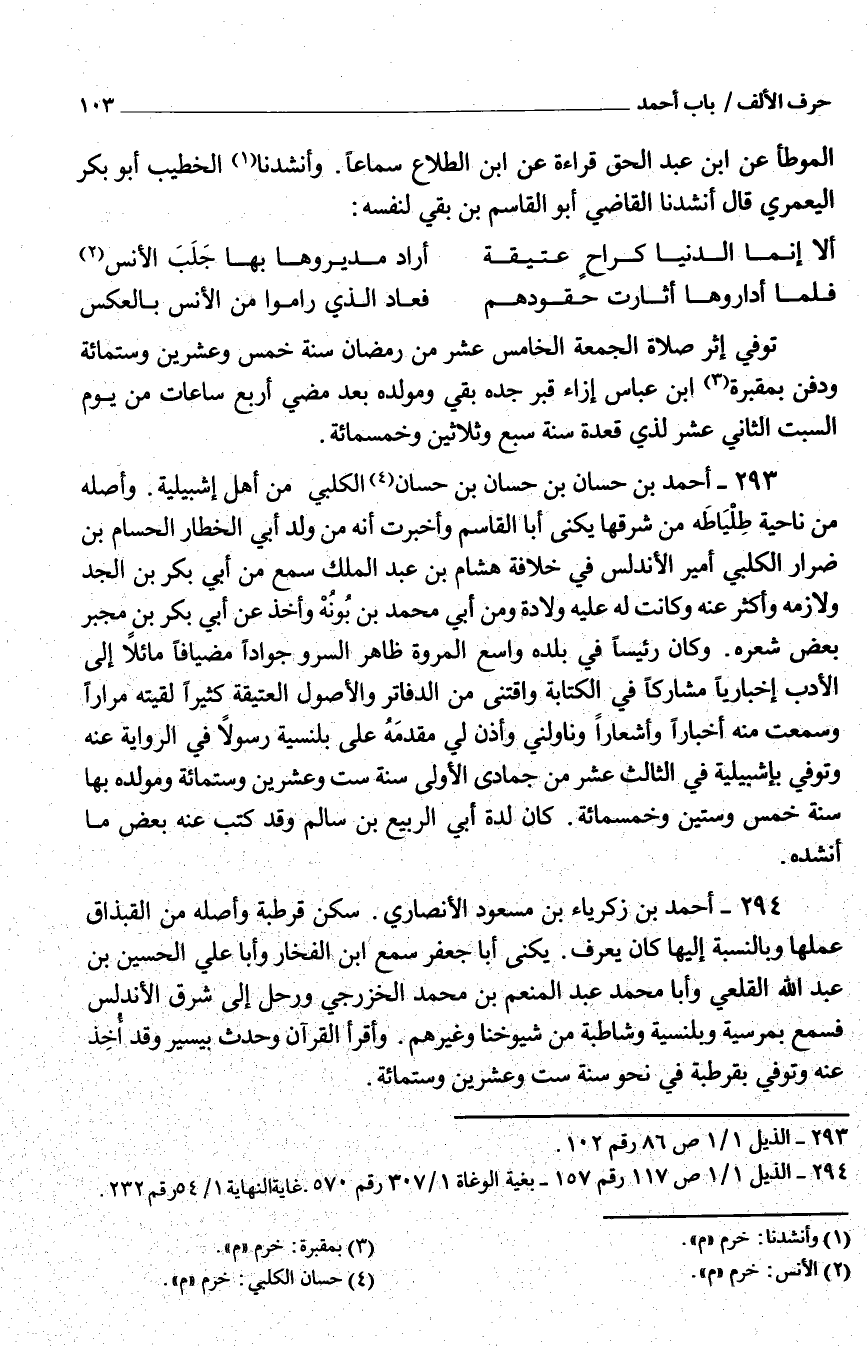 293 - أَحْمَد بْن حسان بْن حسان بْن حسان الْكَلْبِيّ من أَهْلَ إشبيلية وَأَصله من نَاحيَة طِلْيَاطَة من شرقها يكنى أَبَا القَاسِم وأخبرت أَنَّهُ من وُلِدَ أبي الخطار الحسام بْن ضرار الْكَلْبِيّ أَمِير الأندلس فِي خلَافَة هِشَام بْن عَبْد الْملك سَمِعَ من أبي بَكْر بْن الْجد ولازمه وَأكْثر عَنْهُ وَكَانَت لَهُ عَلِيه ولادَة وَمن أبي مُحَمَّد بْن بُونُهْ وَأخذ عَنْ أبي بَكْر بْن مجبر بَعْض شعره وَكَانَ رَئِيسا فِي بَلَده وَاسع الْمَرْوَة ظَاهر السرو جوادًا مضيافًا مائلاً إِلَى الْأَدَب إخباريًا مشاركًا فِي الْكِتَابَة واقتنى من الدفاتر وَالْأُصُول العتيقة كثيرا لَقيته مرَارًا وَسمعت مِنْهُ أَخْبَارًا وأشعارًا وناولني وَأذن لي مقدمَهُ عَلَى بلنسية رَسُولا فِي الرِّوَايَة عَنْهُ وتُوُفيّ بإشبيلية فِي الثَّالِث عَشْر من جُمَادَى الأولى سنة ستٍّ وَعشْرين وستّمائة ومولده بهَا سنة خمس وستِّين وَخَمْسمِائة كَانَ لِدَة أبي الرّبيع بْن سَالم وَقد كتب عَنْهُ بَعْض مَا أنْشدهُ