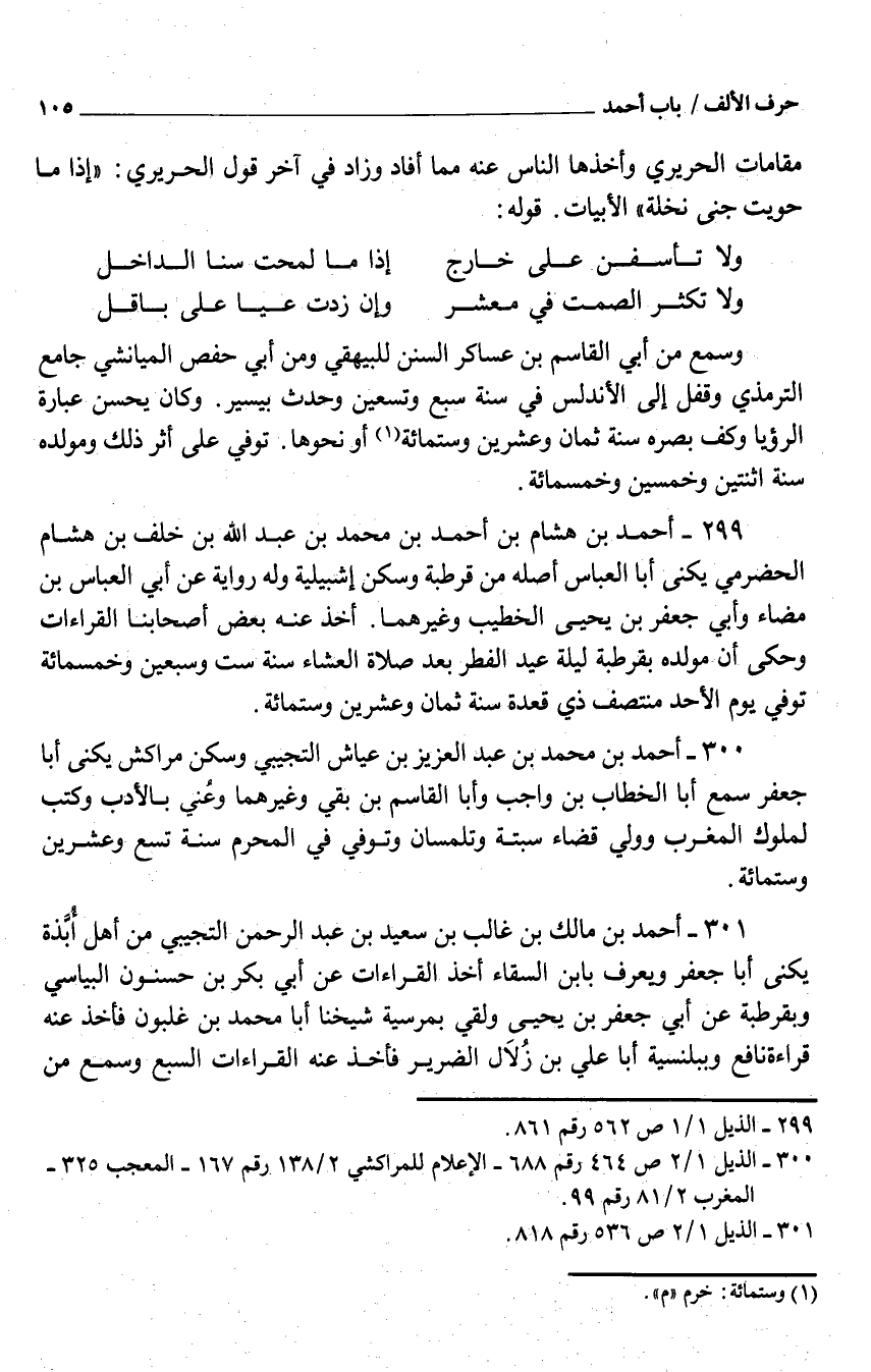 299 - أَحْمَد بْن هِشَام بْن أَحْمَد بْن مُحَمَّد بْن عَبْد اللَّه بْن خَلَف بْن هِشَام الحضْرميّ يكنى أَبَا الْعَبَّاس أَصله من قرطبة وَسكن إشبيلية وَله رِوَايَة عَنْ أبي الْعَبَّاس بْن مضاء وَأبي جَعْفَر بْن يحيى الْخَطِيب وَغَيرهمَا أَخذ عَنهُ بعض أَصْحَابنَا الْقرَاءَات وَحكي أنَّ مولده بقرطبة لَيْلَة عبد الْفطر بَعْدَ صَلاَة الْعشَاء سنة سِتّ وَسبعين وَخَمْسمِائة تُوُفّي يَوْمَ الْأَحَد منتصف ذِي قعدة سنة ثَمَان وَعشْرين وستّمائة