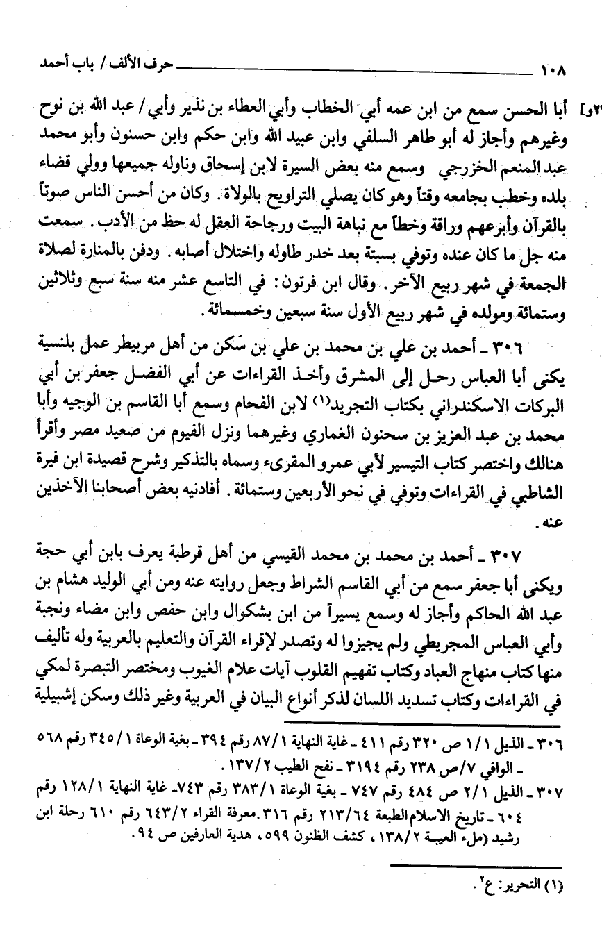 306 - أَحْمَد بْن عَلِيّ بْن مُحَمَّد بْن عَلِيّ بْن سَكن من أَهْلَ مربيطر عمل بلنسية يكنى أَبَا الْعَبَّاس رَحل إِلَى الْمشرق وَأخذ الْقرَاءَات عَنْ أبي الفَضْل جَعْفَر بْن أبي البركات الإسْكَنْدراني بِكِتَاب التَّجْرِيد لِابْنِ الفحام وَسمع أَبَا القَاسِم بْن الْوَجِيه وَأَبا مُحَمَّد بْن عبد الْعَزِيز بْن سَحْنُون الغماري وَغَيرهمَا وَنزل الفيوم من صَعِيد مصر وأقرأ هُنَالك وَاخْتصرَ كتاب التَّيْسِير لأبي عَمْرو المقرىء وَسَماهُ بالتذكير وَشرح قصيدة ابْن فيرة الشاطبي فِي الْقرَاءَات وتُوُفيّ فِي نَحْو الْأَرْبَعين وستّمائة أفادنيه بَعْض أَصْحَابنَا الآخذين عَنْهُ