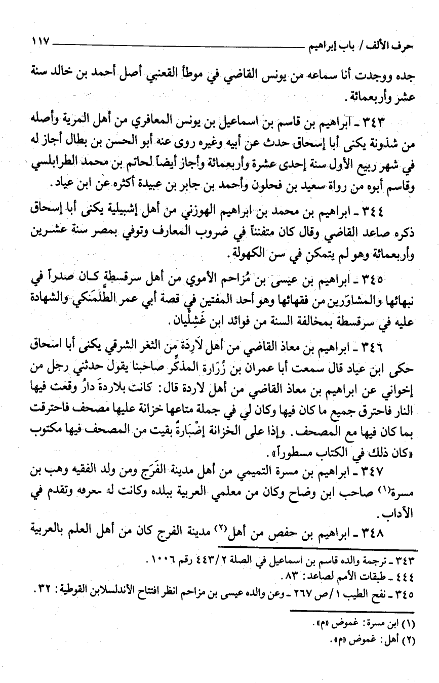 343 - إِبْرَاهِيم بْن قَاسم بْن إِسْمَاعِيل بْن يُونُس الْمعَافِرِي من أَهْلَ المرية وَأَصله من شذونة يكنى أَبَا إِسْحَاق حدَّث عَنْ أَبِيه وَغَيره روى عَنْهُ أَبُو الْحَسَن بْن بطال أجَاز لَهُ فِي شهر ربيع الأوّل سنة إِحْدَى عشرَة وَأَرْبَعمِائَة وَأَجَازَ أَيْضا لحاتم بْن مُحَمَّد الطرابلسي وقاسم أَبُوهُ من رُوَاة سَعِيد بْن فحلون وَأحمد بْن جَابِر بْن عُبَيْدة أَكْثَره عَنِ ابْن عياد