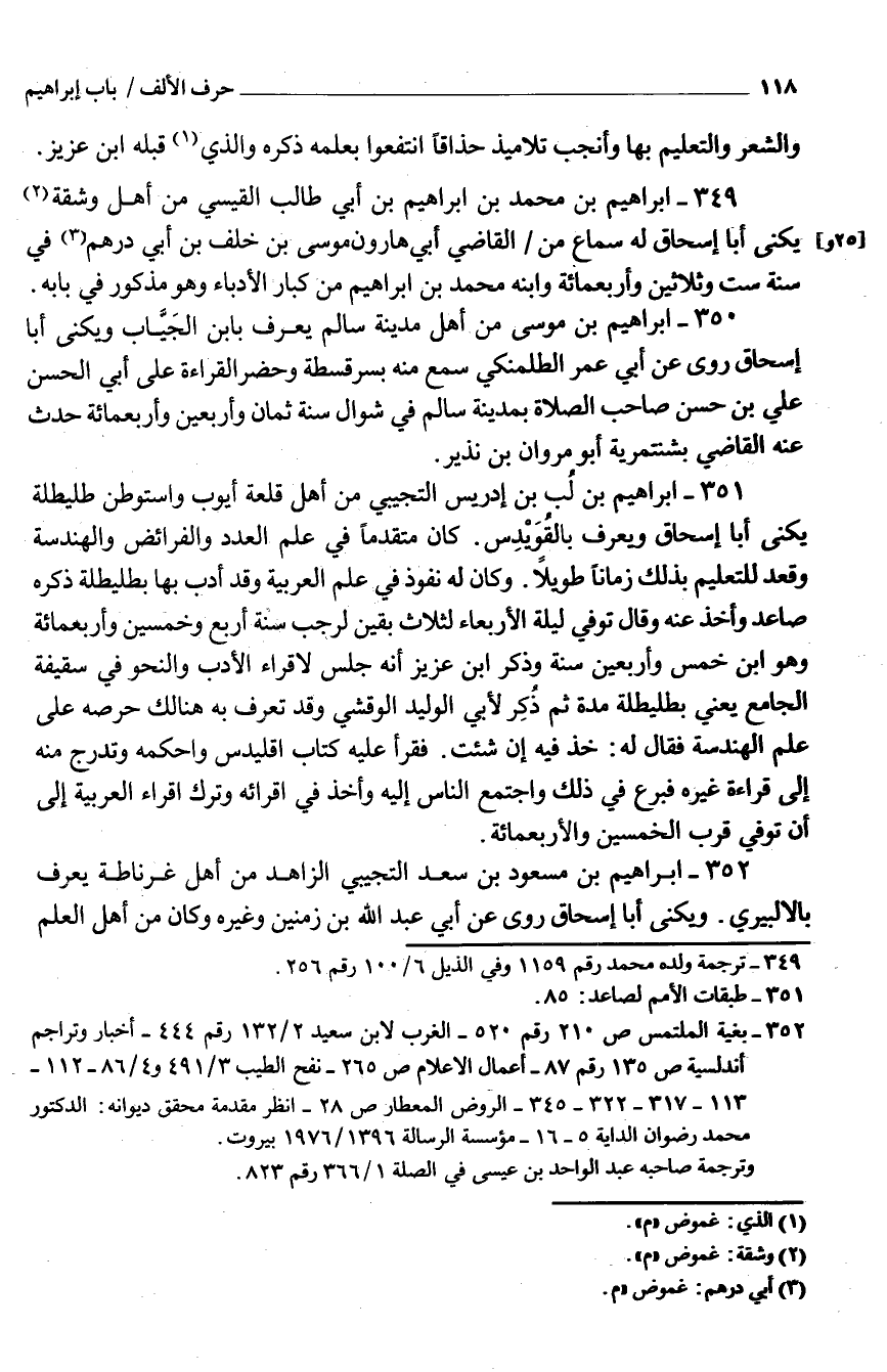 350 - إِبْرَاهِيم بْن مُوسَى من أَهْلَ مَدِينَة سَالم يعرف بِابْن الجَيَّاب ويكنى أَبَا إِسْحَاق روى عَنْ أبي عُمَر الطلمنكي سَمِعَ مِنْهُ بسرقسطة وَحضر الْقِرَاءَة عَلَى أبي الْحَسَن عَلِيّ بْن حَسَن صَاحب الصَّلاة بِمَدِينَة سَالم فِي شَوَّال سنة ثَمَان وَأَرْبَعين وَأَرْبَعمِائَة حدَّث عَنْه القَاضِي بشنتمرية أَبُو مَرْوَان بْن نَذِير