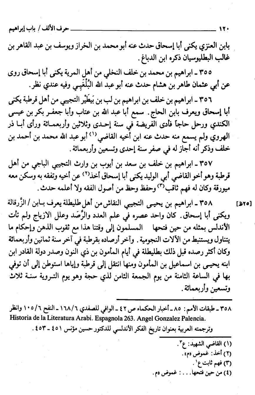 358 - إِبْرَاهِيم بْن يحيى التجِيبِي النقاش من أَهْلَ طليطلة يعرف بِابْن الزَّرقالة ويكنى أَبَا إِسْحَاق كَانَ وَاحِد عصره فِي عَلَمُ الْعدَد والرَّصَد وَعلل الأزياج وَلم تأت الأندلس بِمِثْلِهِ من حِين فتحهَا الْمُسلمُونَ إِلَى وقتنا هَذَا مَعَ ثقوب الذِّهْن وإحكام مَا يتَنَاوَل ويستنبط من الْآلَات النجومية وَآخر أرصاده بقرطبة فِي آخر سنة ثَمَانِينَ وَأَرْبَعمِائَة وَكَانَ أَكثر رصده قبل ذَلِك بطليطلة فِي أيّام الْمَأْمُون بْن ذِي النُّون صدر دولة الْقَادِر ابْن ابْنه يحيى بْن إِسْمَاعِيل بْن الْمَأْمُون وَمِنْهَا انْتقل إِلَى قرطبة وَإِيَّاهَا استوطن إِلَى أنَّ تُوُفّي بهَا فِي السَّاعَة الثَّامِنَة من يَوْمَ الجُمُعَة الثَّامِن لذِي حجَّة وَهُوَ يَوْمَ التَّرويَة سنة ثَلَاث وَتِسْعين وَأَرْبَعمِائَة